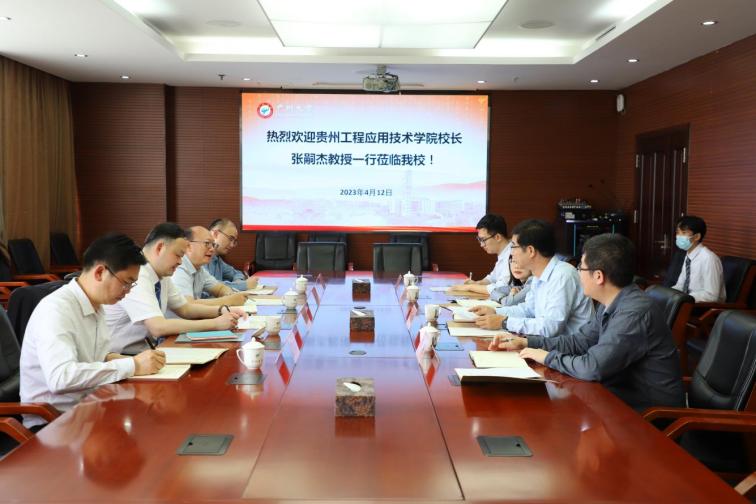 会上,两校领导分别介绍学校情况并对下一步的工作开展提出要求。邓成明指出,两校多年来保持良好的互动,对口帮扶工作取得实效,在干部跟岗学习、项目申报指导、学生社会实践、本科生联合培养、国际学生交流等落地落实。下一步,结合学校建设发展实际和需要,两校持续深化合作,两校进一步做好高层次人才培养及团队建设、学科专业建设、硕士点建设、学生升硕等方面的支持与合作。张嗣杰指出,广州大学多年来对贵州工程应用技术学院建设发展给予了关心和大力支持,在人才培养、管理及师资队伍建设、科学研究等方面得到提升,学校的影响力持续增强。下一步,在学科专业调整建设、高层次人才培养与引进、硕士点建设、中外学生交流等方面持续得到广州大学的支持和帮助,合作共赢,共同发展。两校参会人员就具体工作进行了深入交流。