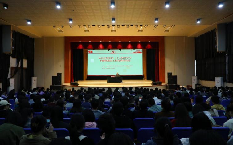 为深入贯彻学习党的二十大精神,贯彻落实全国“两会”精神,高举中国特色社会主义伟大旗帜,进一步引导广大师生深刻领悟“两个确立”的决定性意义,自觉做到“两个维护”,在思想上政治上行动上同以习近平同志为核心的党中央保持高度一致。4月24日下午,学校党委书记令狐荣锋以“认真开展党的二十大精神学习,不断推进贵工程高质量发展”为题,在正心礼堂为全校师生讲授了一堂培根铸魂、启智润心的形势与政策专题讲座。全校无课班主任、辅导员、团总支书记、学生会主席、各班团支部书记、班长及马克思主义学院全体师生参加。讲座由马克思主义学院院长漆国江主持。