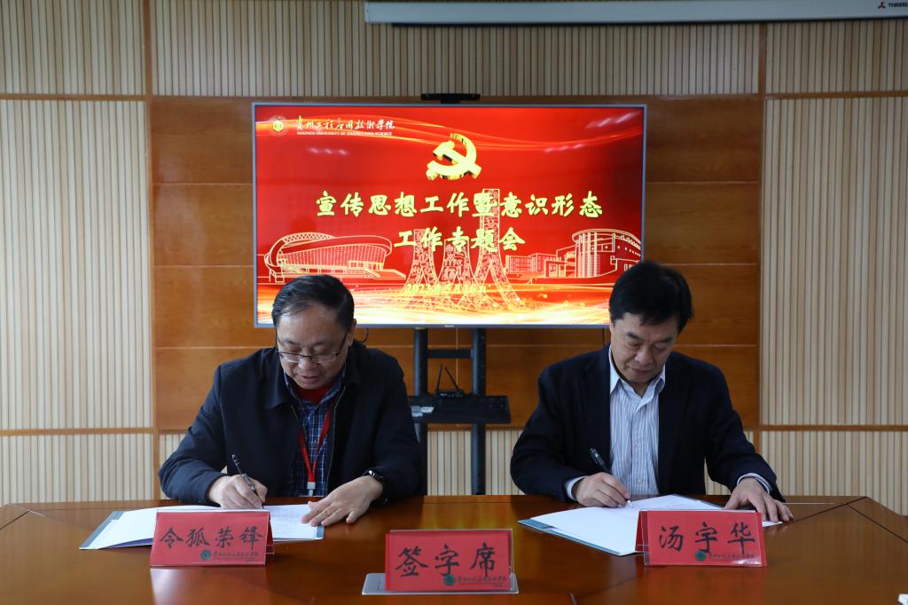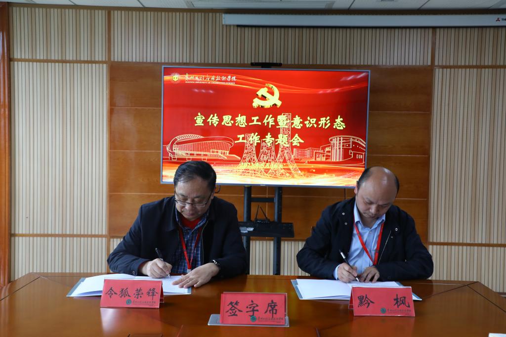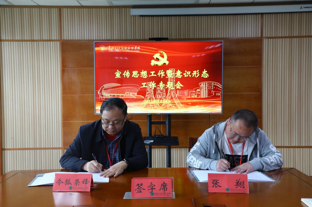 会上,汤宇华同志领学《习近平论宣传思想工作》中关于“把宣传思想工作做得更好”和“意识形态关乎旗帜、关乎道路、关乎国家政治安全”等两个方面的重要论述;赵军同志领学中央、省委关于网络意识形态的相关文件精神;宣传部负责同志就2023年学校宣传思想工作要点进行解读;令狐荣锋与党委班子成员代表、党总支书记代表、直属党支部书记代表签订2023年《意识形态工作责任书》。