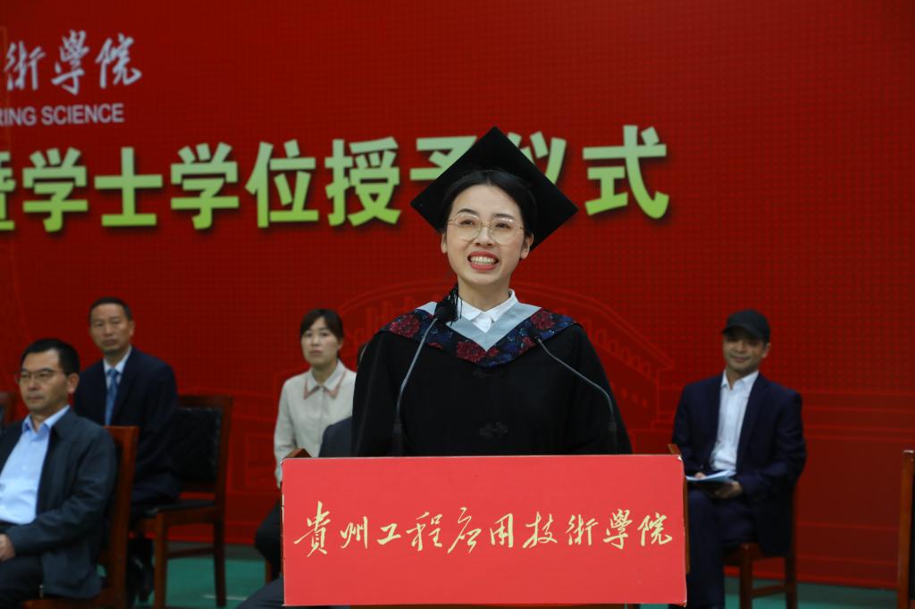 毕业生代表、生态工程学院2019级地理科学专业本科班母圆圆回顾了四年来的收获成长与心路历程。她呼吁毕业生们牢记“明德笃学.弘毅力行”的校训,在矢志报国的新征途中,把“艰苦创业·不断进取”的贵工程精神发扬光大,成为拥有智慧并富有激情、胸怀大志并脚踏实地、富有责任并敢于勇挑重担的人,让青春在全面建设社会主义现代化国家的新征程上绽放绚丽之花。