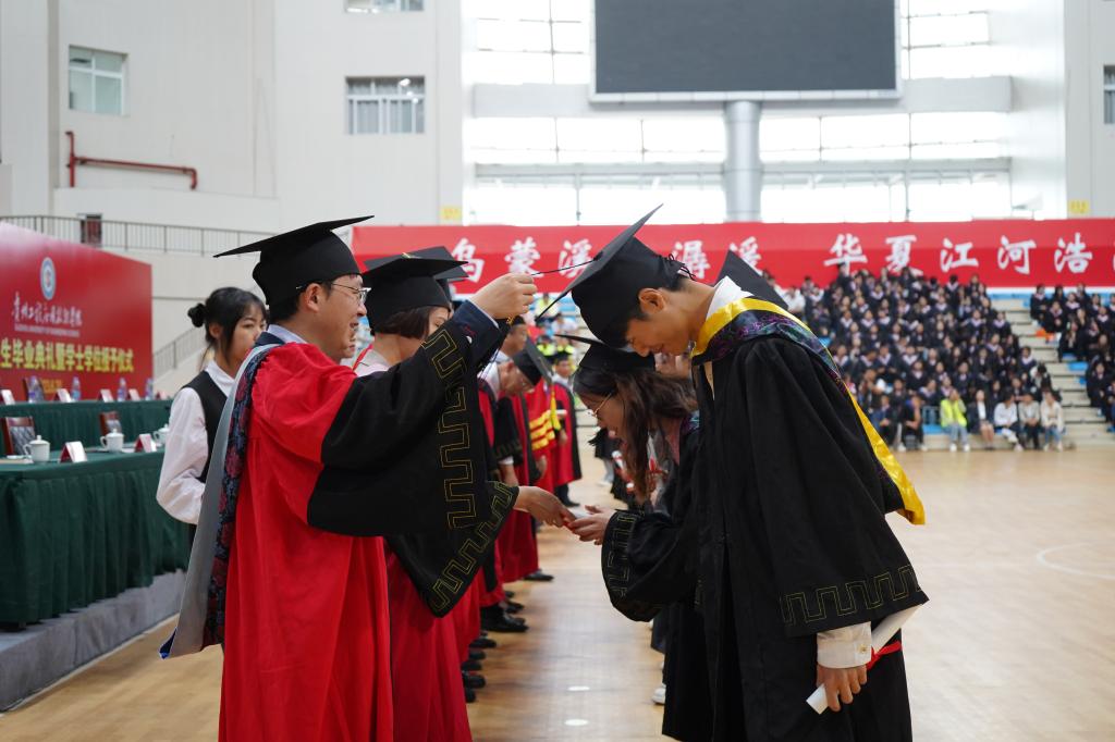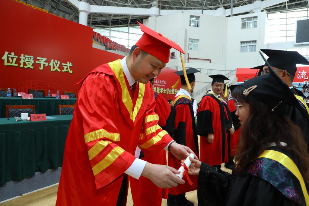 校领导向毕业生代表颁发毕业证书;杨友昌宣读2023届毕业生学士学位授予文件;授位老师为2023届学士学位获得者授位。最后,参加典礼的各位领导移步主席台对面照相点与毕业生合影。