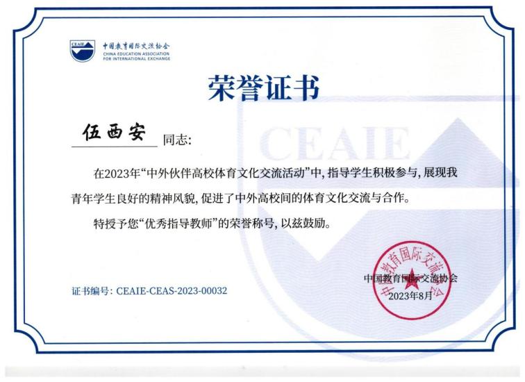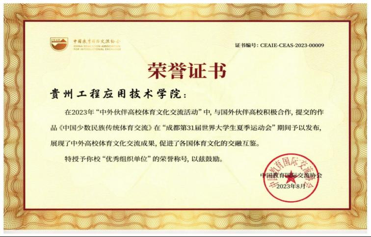 在成都第31届世界大学生夏季运动会期间,我校积极参加由中国教育国际交流协会组织开展的2023年“中外伙伴高校体育文化交流活动”,组织提交《中国少数民族传统体育交流》视频作品,该作品在“成都第31届世界大学生夏季运动会”期间予以发布,展现了中外高校体育文化交流成果,促进了各国体育文化的交融互鉴。学校在此活动中荣获“优秀组织单位”荣誉称号,武西安、蒋思庆两位老师荣获“优秀指导老师”荣誉称号。