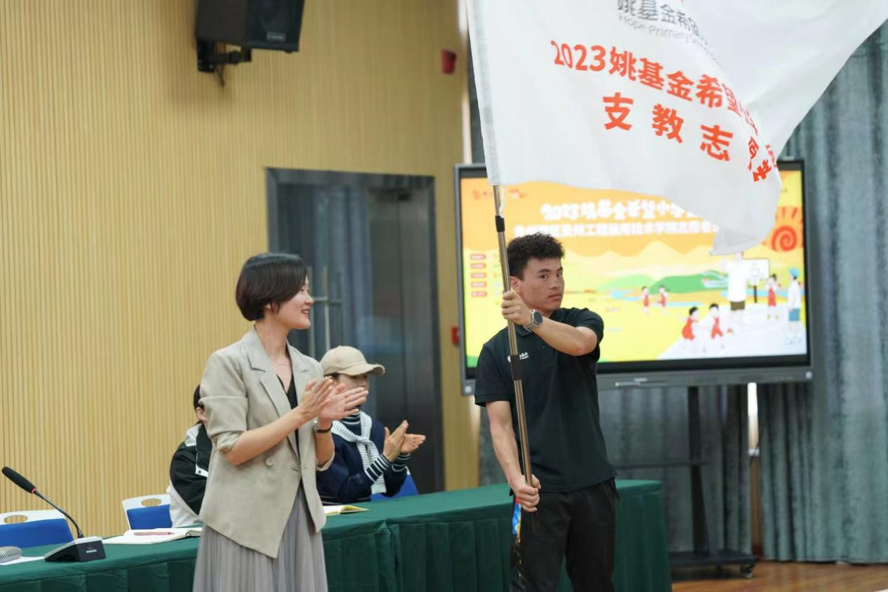 校团委书记高翩翩、体育学院院长刘海燕分别为毕节市织金县和黔东南州台江县的支教志愿者进行授旗。