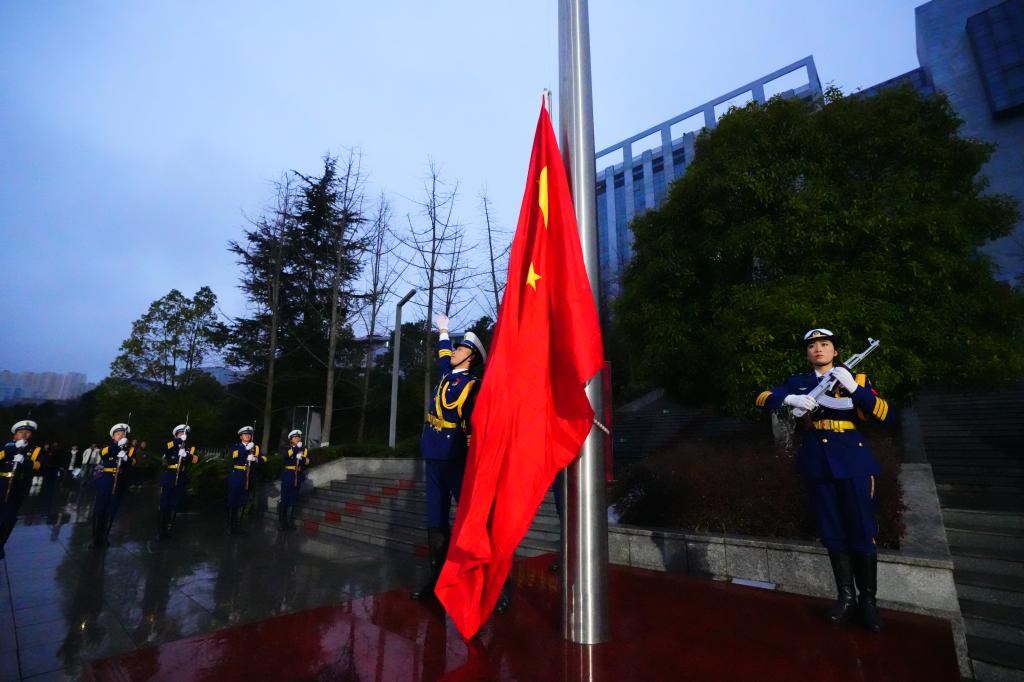 清晨7时20分,英姿勃发的国旗护卫队迈着整齐划一、气势非凡的步伐,护送着五星红旗走向升旗台。全体师生肃穆庄严,向国旗行注目礼、共唱国歌。在晨光熹微的清晨,国旗缓缓上升,迎风飘扬。