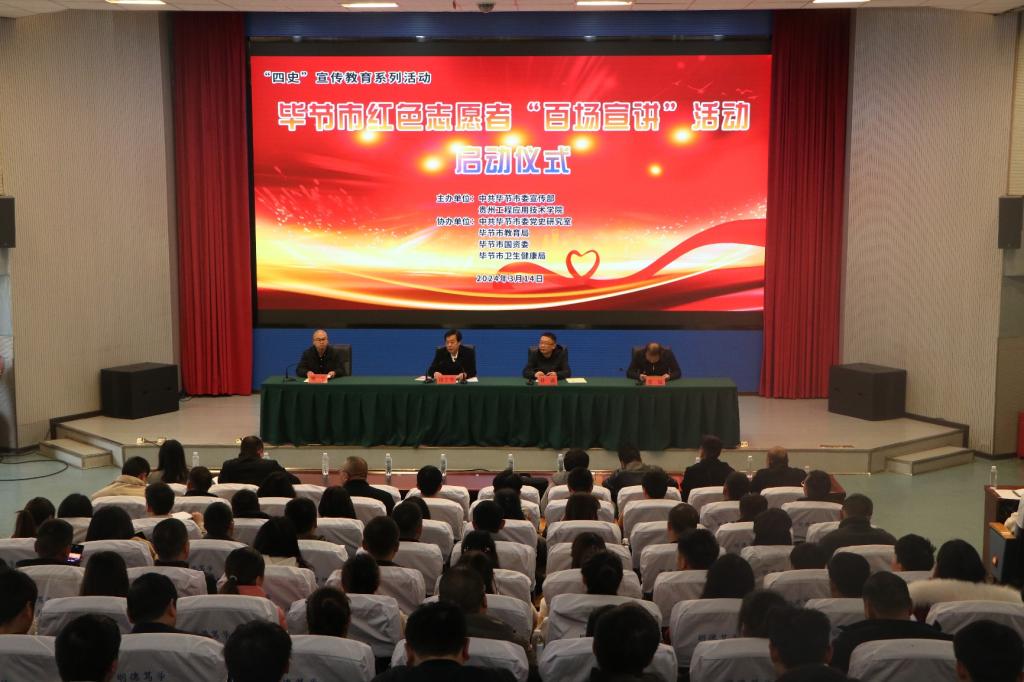 文以载道,物传精神。为了动员各级各部门加强红色文化传播,加强红色文化资源利用,凝聚强大精神力量。3月14日下午,毕节市红色志愿者“百场宣讲”活动的启动仪式在我校身修讲堂举行。毕节市委党史研究室主任张猛,毕节市委宣传部副部长、文明办主任杜鑫,毕节市委党史研究室副主任刘宇出席仪式。我校党委副书记汤宇华出席并主持。