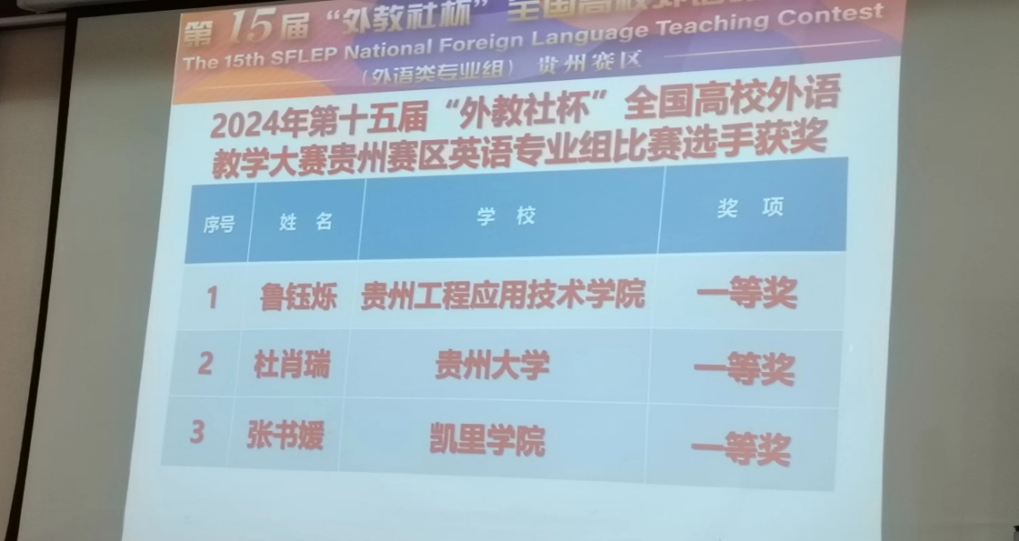 6月21日,由上海外国语大学学术指导,贵州省大学外语教学研究会、贵州省外语学会和上海外语教育出版社主办,贵州理工学院承办的2024年第十五届“外教社杯”全国高校外语教学大赛贵州赛区英语专业组比赛圆满落下帷幕。经过激烈的角逐,贵州工程应用技术学院外国语学院鲁钰烁荣获英语专业组一等奖。