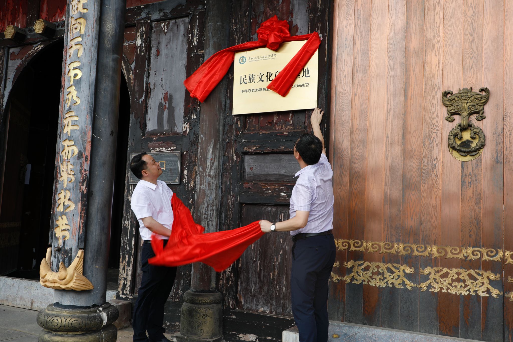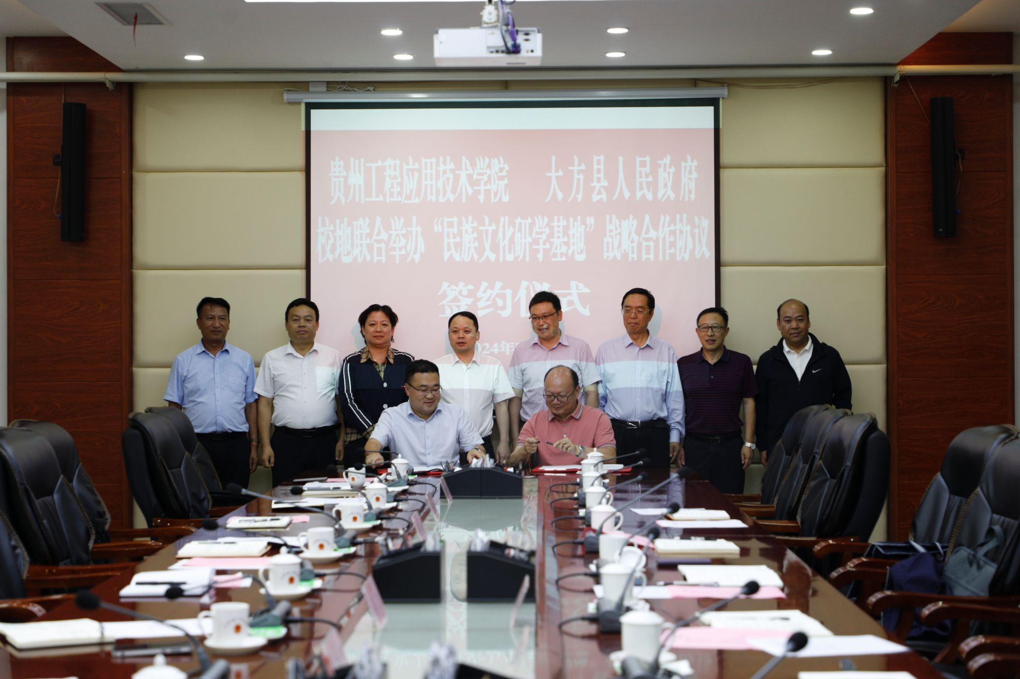 李琳代表贵州工程应用技术学院与大方县人民政府签订合作协议;肖建宗与杨滨共同为贵州工程应用技术学院民族文化研学基地揭牌。