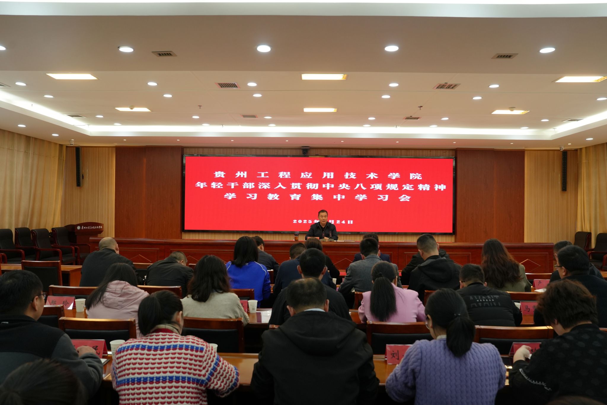 陈兴才在会上指出,年轻干部务必坚定不移做到三个持之以恒:一是在理论学习上持之以恒。以深入贯彻中央八项规定精神学习教育为契机,严格对标省级专班方案,深入学习总书记关于加强作风建设的重要论述,不断提升思想认识;二是在工作落实上持之以恒。本次学习教育学校已制定详实方案,各支部结合实际,迅速制定计划,年轻干部自查自纠,关键岗位干部梳理风险点并对照整改,全面查摆问题,以此塑造正确权力观,确保权力在阳光下运行;三是在成果巩固上持之以恒。纪律规矩意识教育是一项长期的、永无止境的工程,纪律观念培养、作风建设改进、思想防线筑牢永远在路上,全体干部必须时刻保持高度警醒,以实际行动践行初心使命,以优良作风护航党和国家事业高质量发展。