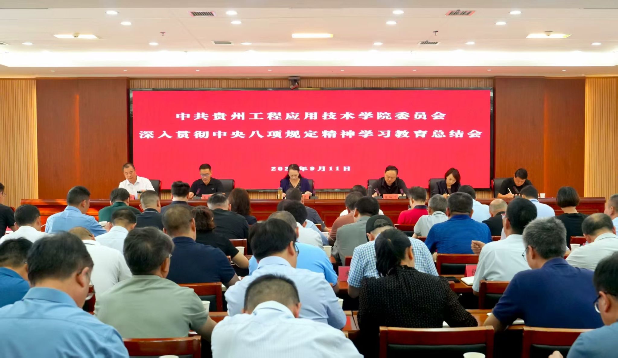 9月11日上午,中共贵州工程应用技术学院委员会召开深入贯彻中央八项规定精神学习教育总结会。会议传达学习了习近平总书记重要指示精神,中央、省委党建工作领导小组会议精神,全面系统总结了学校党委深入贯彻中央八项规定精神学习教育情况。我校党委书记熊星主持会议并讲话。党委副书记、校长张嗣杰,党委副书记王春华,党委委员、副校长饶萍,党委委员、组织部部长陈兴才,党委委员、宣传部(统战部)部长夏鲲参加。