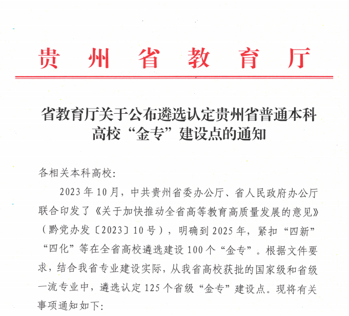 近日,省教育厅发布了《关于公布遴选认定贵州省普通本科高校“金专”建设点的通知》,我校机械电子工程、采矿工程、计算机科学与技术、土木工程四个专业获批省级“金专”建设点,这是我校专业建设取得的又一重大标志性成果。