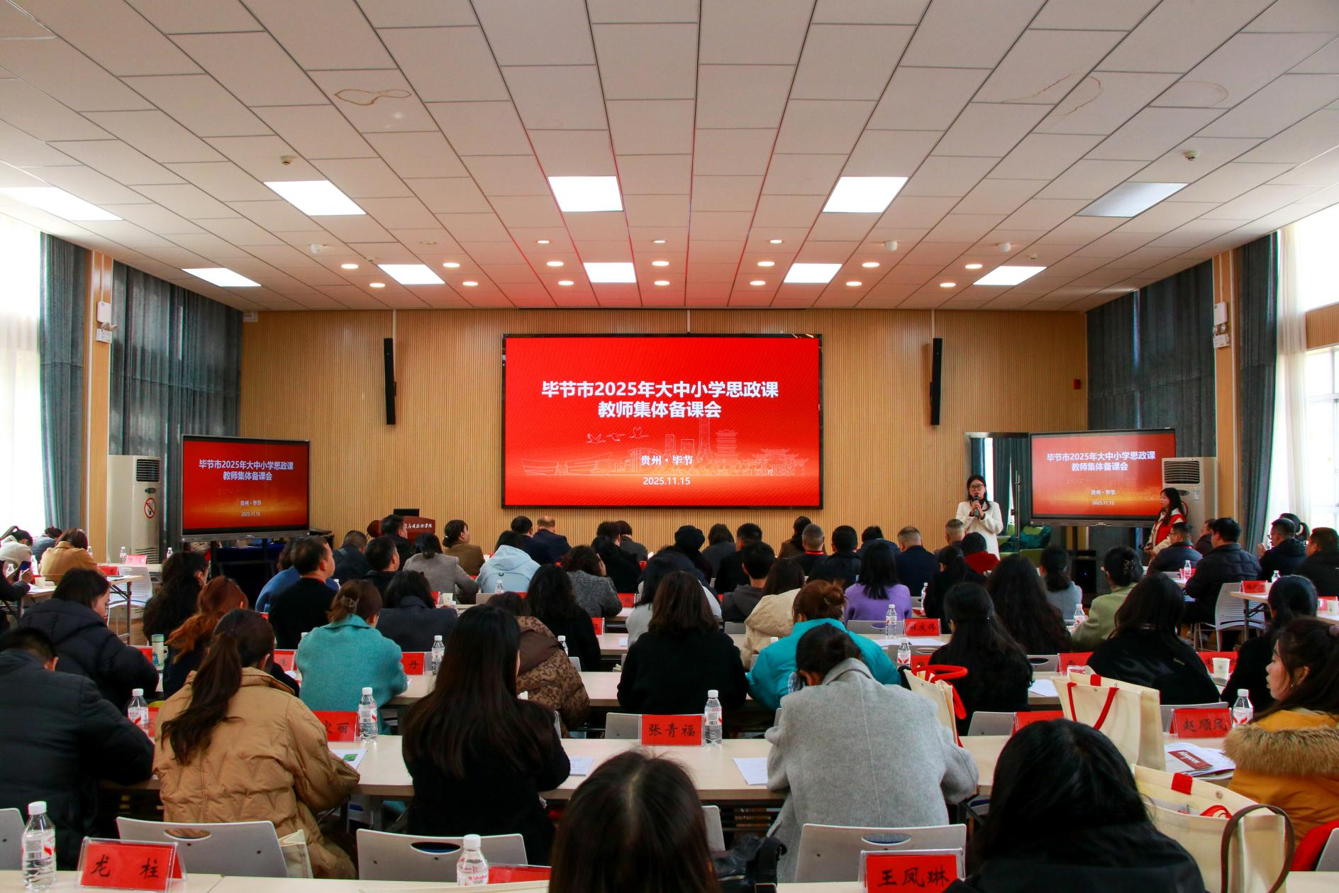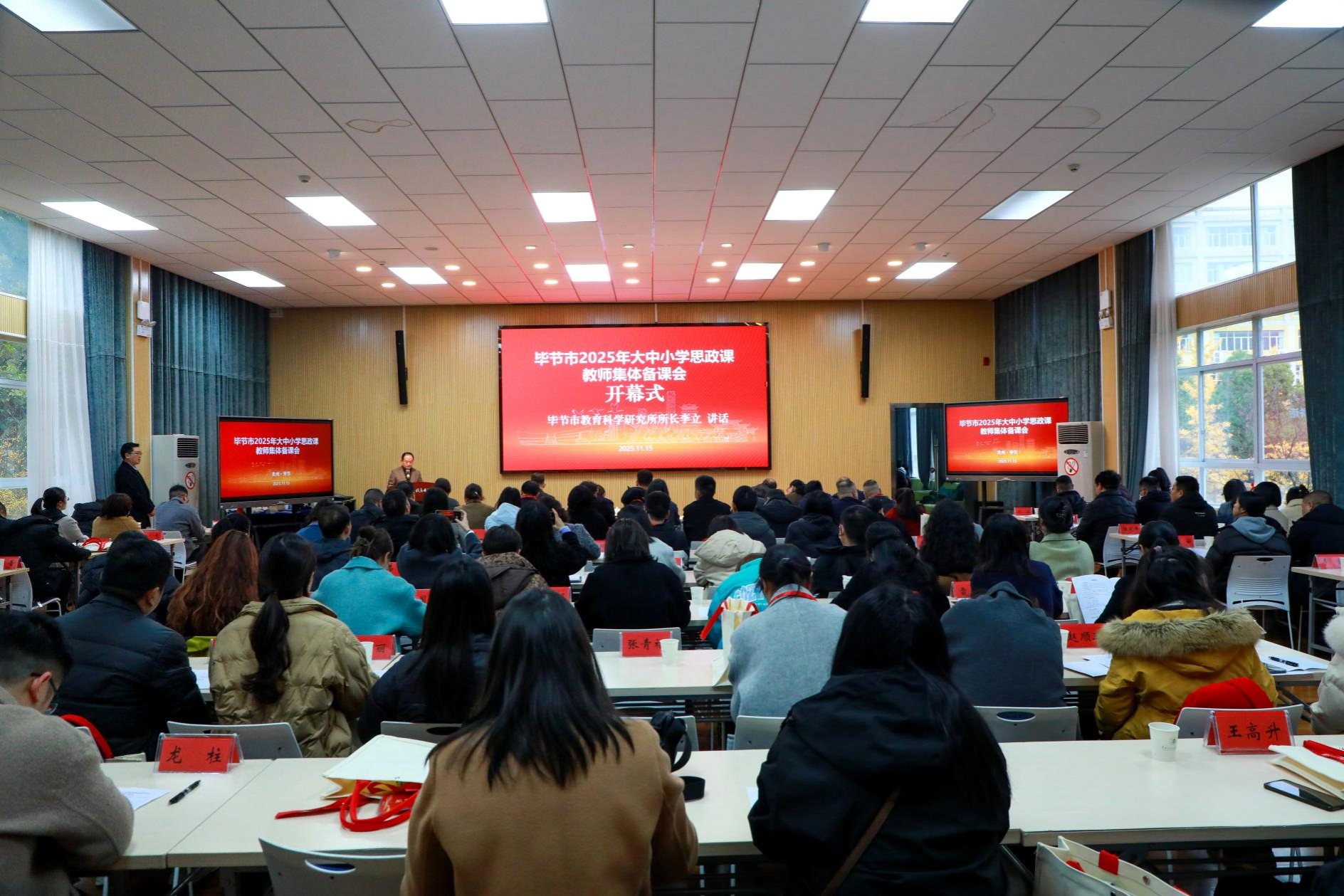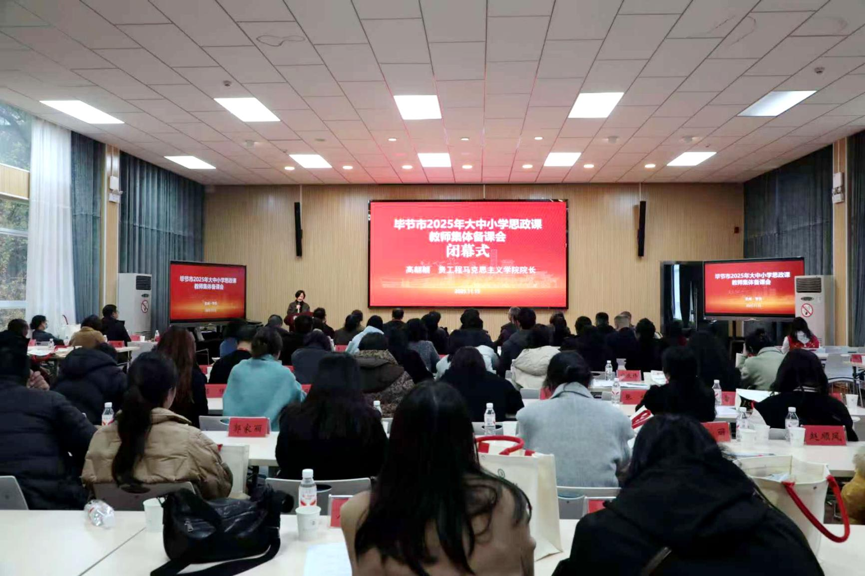 为深入贯彻落实立德树人根本任务,破解大中小学思政课学段衔接壁垒,激活本土红色资源育人效能,11月15日,由我校与毕节市教育局联合主办,我校马克思主义学院承办的毕节市2025年大中小学思政课教师集体备课会在仲群楼二楼会议室圆满举行。我校党委副书记王春华、毕节市教育科学研究所所长李立出席开幕式并致辞,来自全市各区县的教育局有关负责人、思政课教研员、大中小学思政课骨干教师代表共100余人齐聚一堂,共话思政课一体化建设新路径。我校党委常委、宣传部(统战部)部长李文彬主持开幕式。