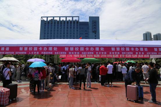 走在明德广场,可以看到广场上一排排整齐坐落的服务咨询站点和各学院迎新据点;烈日当空,晴空万里,在站点服务的学生会成员和志愿者们始终面带微笑,用师哥师姐的热情、志愿者的爱心去迎接每一位新同学的到来,从报名处到注册处,再到缴费处、军训服领取处,最后到寝室门口,处处涌动着他们忙碌的身影,他们拉行李箱、搬被褥、领军训服、缴纳学费,忙得不亦乐乎。