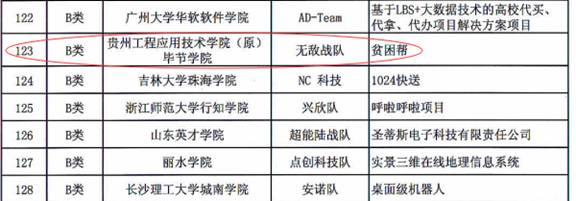 近日,“第八届中国大学生服务外包创新创业大赛”决赛晋级名单及获奖情况揭晓。由信息工程学院副院长(主持工作)王力教授指导学生张宏、胡文韬、王似超、陈建飞、李正平组成的“无敌战队”的参赛作品《贫困帮》荣获全国三等奖。我校为贵州省唯一获奖高校。