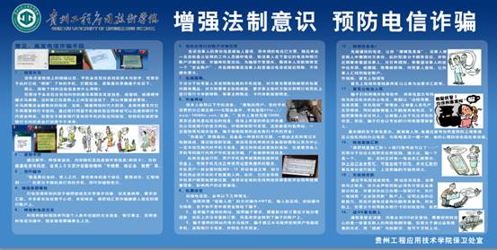 近日,不法分子以种种手段,精心布局,远程实施,利用电话、网络等短讯工具冒充国家机关单位工作人员诈骗大学生,大学生成电信网络诈骗受害“重灾区”,为提高师生防范电信网络诈骗的意识和技能,遏制电信网络诈骗犯罪高发态势,贵州工程应用技术学院开展一系列防范电信网络诈骗宣传活动。
