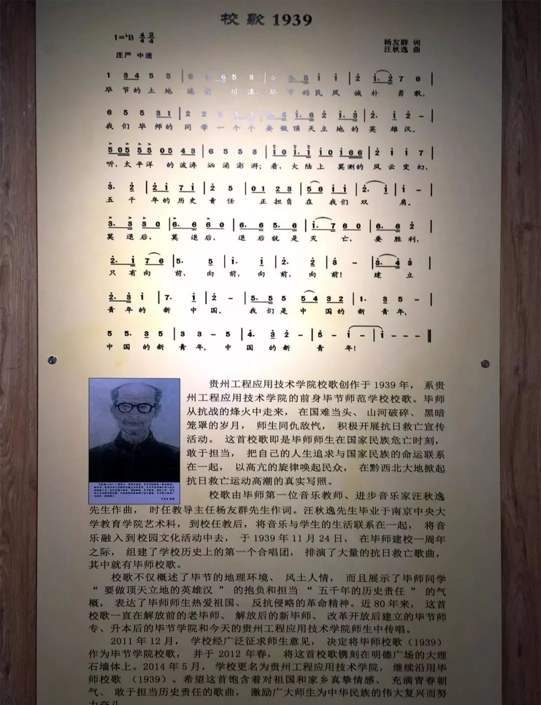 从全国各所大学流亡到毕节的师生,用他们的爱国激情为年轻的毕节师范学校注入了浓厚的大学精神。“毕节的土地连锁川滇,毕节的民风诚朴勇敢,我们毕师的同学一个个要做顶天立地的英雄汉……”这首创作于1939年的《毕师校歌》,昂扬向上,激情澎湃。