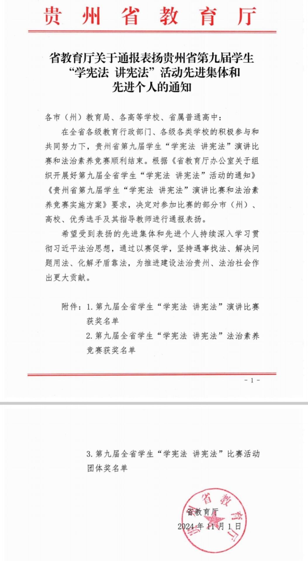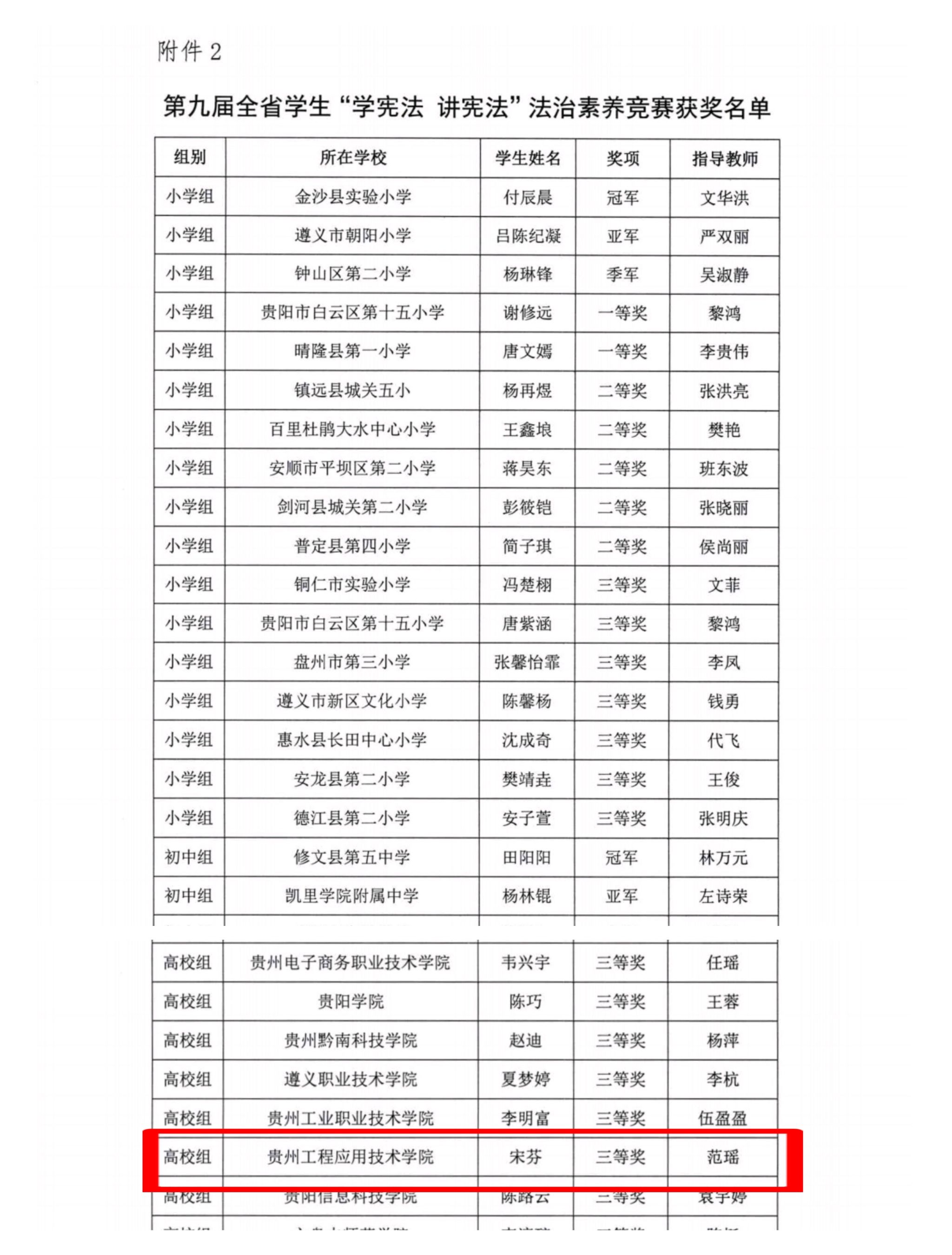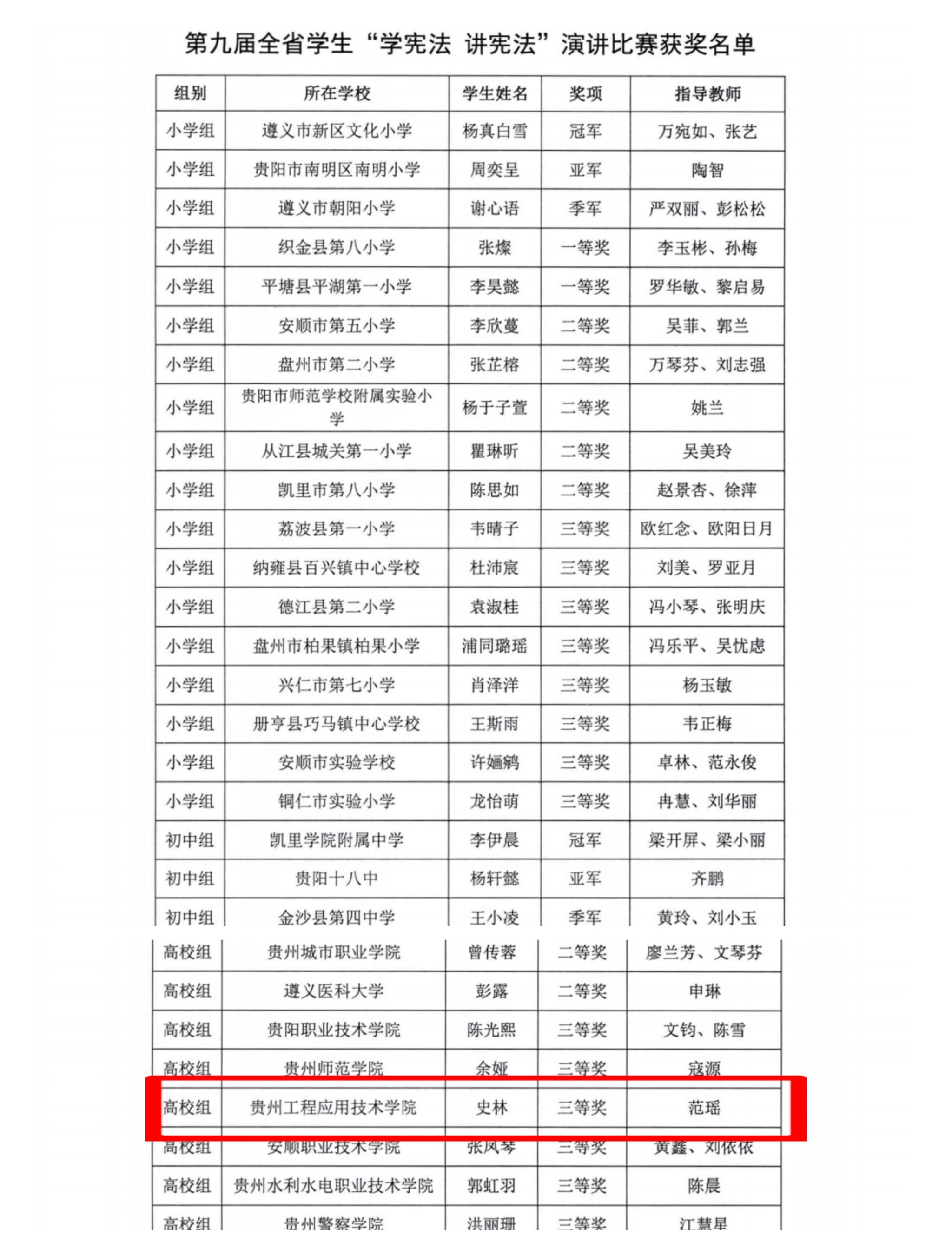 11月1日,在全省各级教育行政部门、各级各类学校的积极参与和共同努力下,贵州省第九届学生“学宪法 讲宪法”演讲比赛和法治素养竞赛圆满落幕。经过激烈的角逐,贵州工程应用技术学院史林同学、宋芬同学分别荣获了演讲比赛和法治素养竞赛高校组三等奖。
