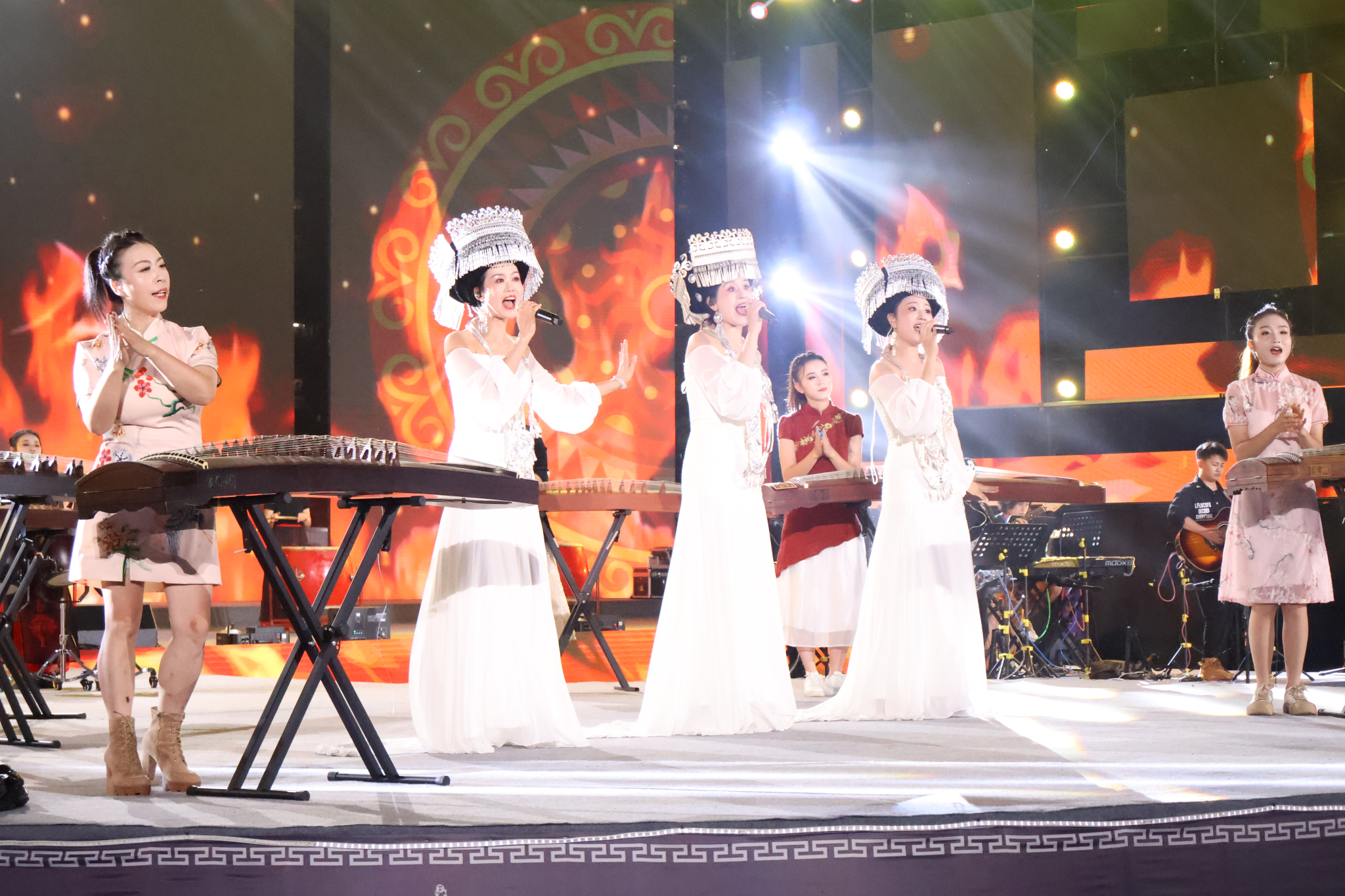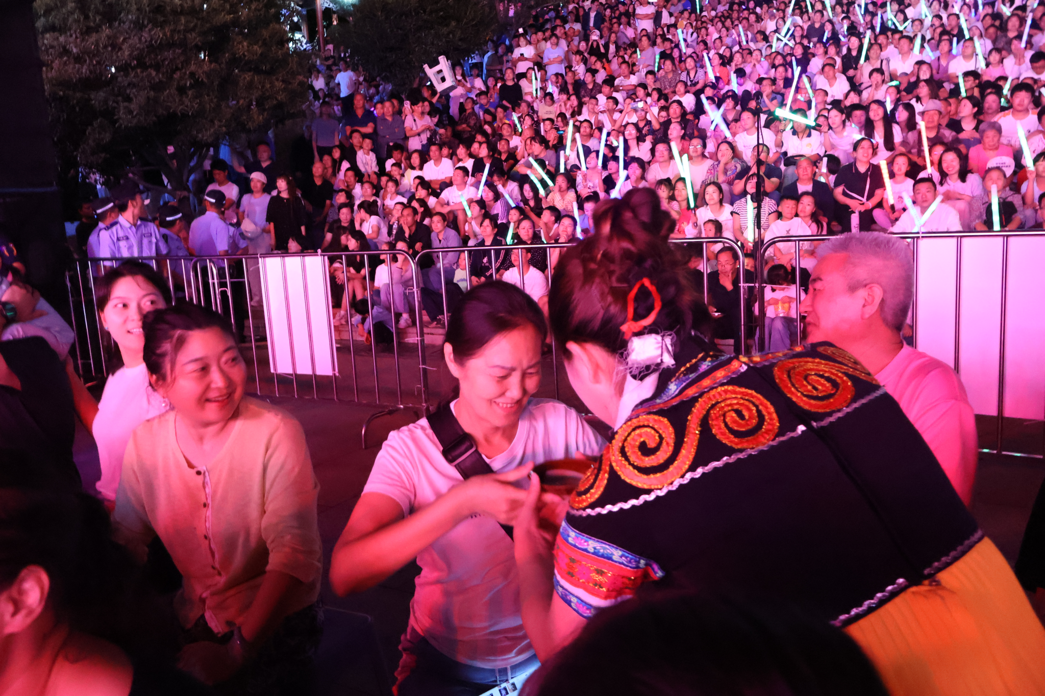 音乐会开场便自带“燃点”。电音的动感节奏、新民乐的婉转韵律、鼓乐的铿锵力量与新民歌的质朴情怀碰撞融合,一组跨界联唱瞬间点燃全场氛围。《彝家酒歌》《祝酒歌》响起时,身着民族服饰的彝族姑娘端着酒碗穿梭在观众席间,热情邀请大家共品美酒;当经典曲目《奢香夫人》的旋律响起,全场观众自发加入合唱,伴随着舞台上空绽放的璀璨烟火,现场瞬间化作一片欢乐的海洋。