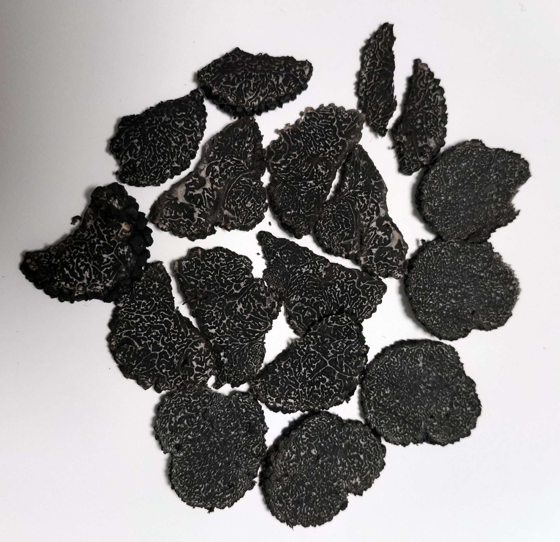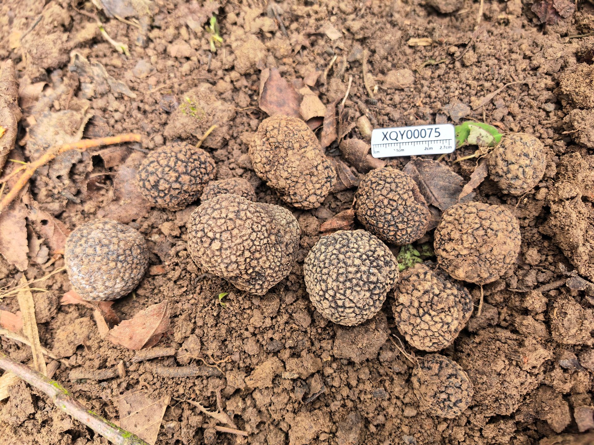黑松露,学名块菌,是一种珍贵的野生食用菌,素有“厨房里的黑钻石”“来自天堂的味道”之称,与鹅肝、鱼子酱并称为世界三大顶级美食。此次在七星关区发现的松露子实体有32个,形状为规则的圆形、最大直径达到4.5厘米,表面呈黑褐色且有不规则疣状突起,切面可见明显的白色菌脉纹理,散发着独特的浓郁香气。