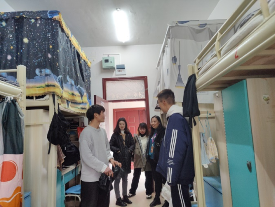 每到一间寝室,院领导和老师都与学生亲切交谈,了解学生日常的学习情况和生活情况,并认真向学生了解和细心检查宿舍是否存在设施损坏与安全隐患等问题。