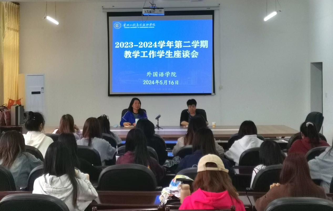 为进一步加强外国语学院教风和学风建设,全面了解教师教学情况和全面了解学生对学院教育教学、管理服务等方面的意见和建议,准确把握学生思想、学习、生活动态,及时了解学生诉求,进一步落实“以生为本”的理念,突出“为学生服务”的宗旨,充分调动学生参与管理的积极性和主动性,改进教学和管理工作,加强师生联系,进一步增强学院教学质量和管理服务工作的针对性和实效性,提高广大学生的学习热情,外国语学院于2024年5月16日召开了2023-2024学年第二学期期中教学工作学生座谈会。座谈会由教学科研科科长罗俊主持,特邀学校教学督导团王乔英老师参加和各班学生代表21名参加。