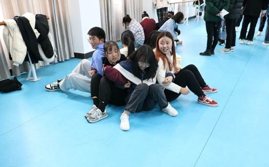 随着第一场比赛的结束,很快也迎来了第二场比赛——“坐地起身”,考验的是同学之间的默契与配合,不负众望,活动中各小组之间协调配合,很快,两人、三人……六人一起有泰山之势,一同起身,完成此次比赛。