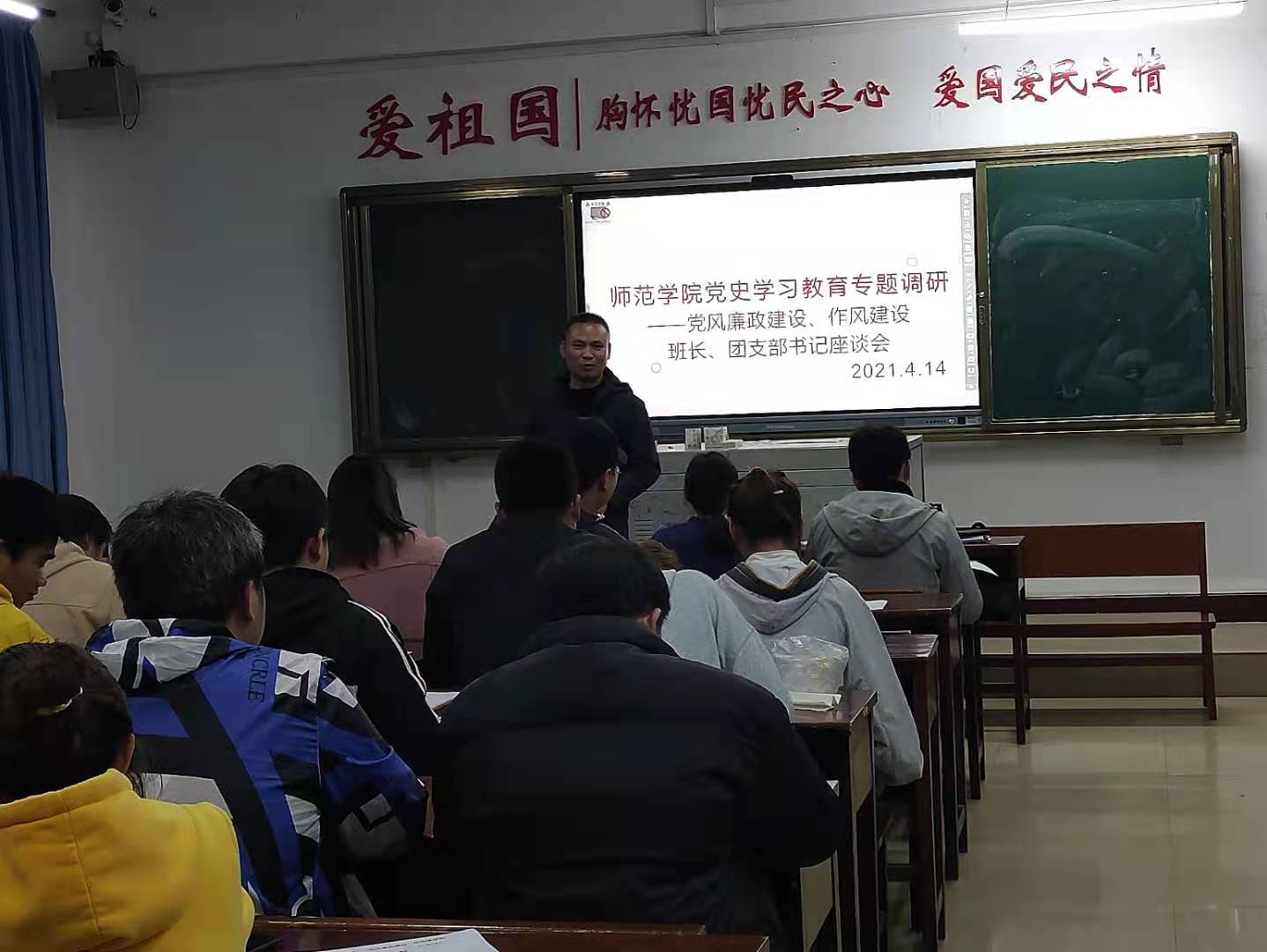 2021年4月14日晚,师范学院在绣山教学楼B-104教室召开党史学习教育专题调研——党风廉政建设、作风建设班长、团支部书记座谈会。会议由学院党总支书记赵炜书主持,学院各班班长、团支部书记参加了座谈。