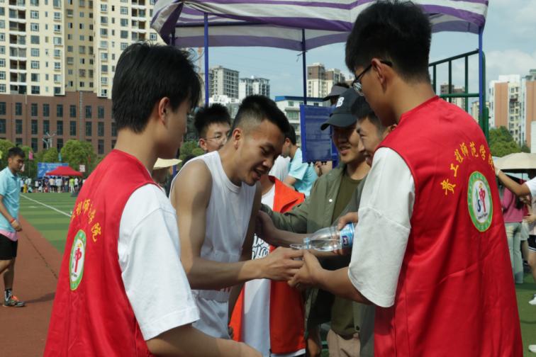 (师范学院学生会志愿者为运动员倒矿泉水)