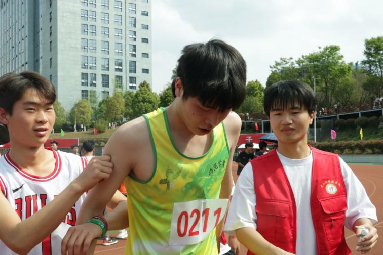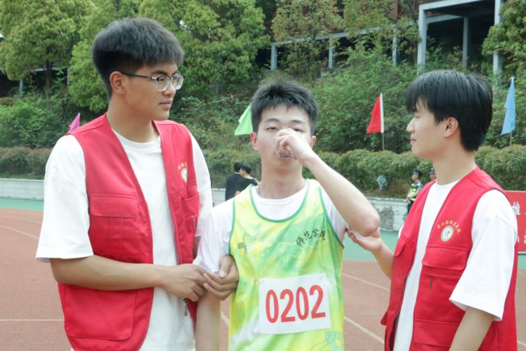 (师范学院学生会志愿者搀扶运动员)