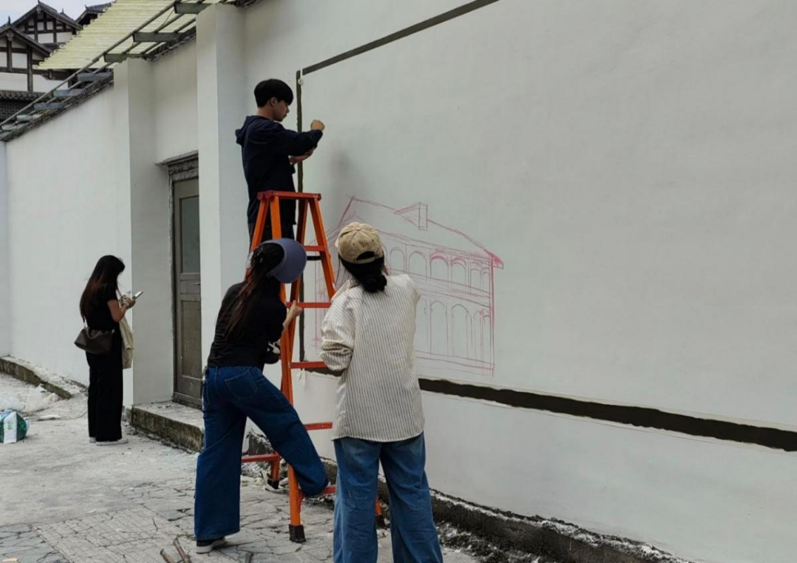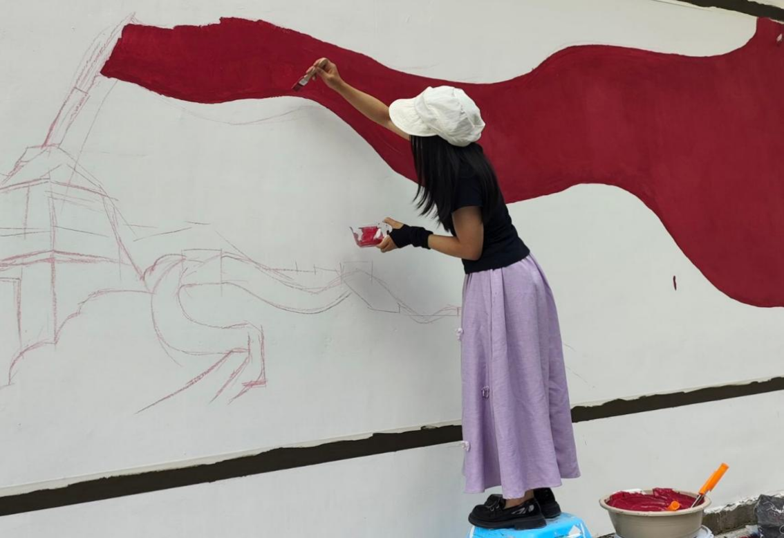 墙绘现场,学子们不怕苦不怕累,分工协作,默契配合。有的蹲在地面勾勒形状轮廓,有的站在手脚架上填充色彩,有的配合指导调色传递工具,有的建言献策将创新细节融入画面中。阳光之下,画笔与颜料碰撞出热烈的火花,原本单调的墙面逐渐变得生动鲜活。偶有路过的人驻足观看,不时发出称赞,场面显得热闹了起来,呈现出一派欣欣向荣的景象。