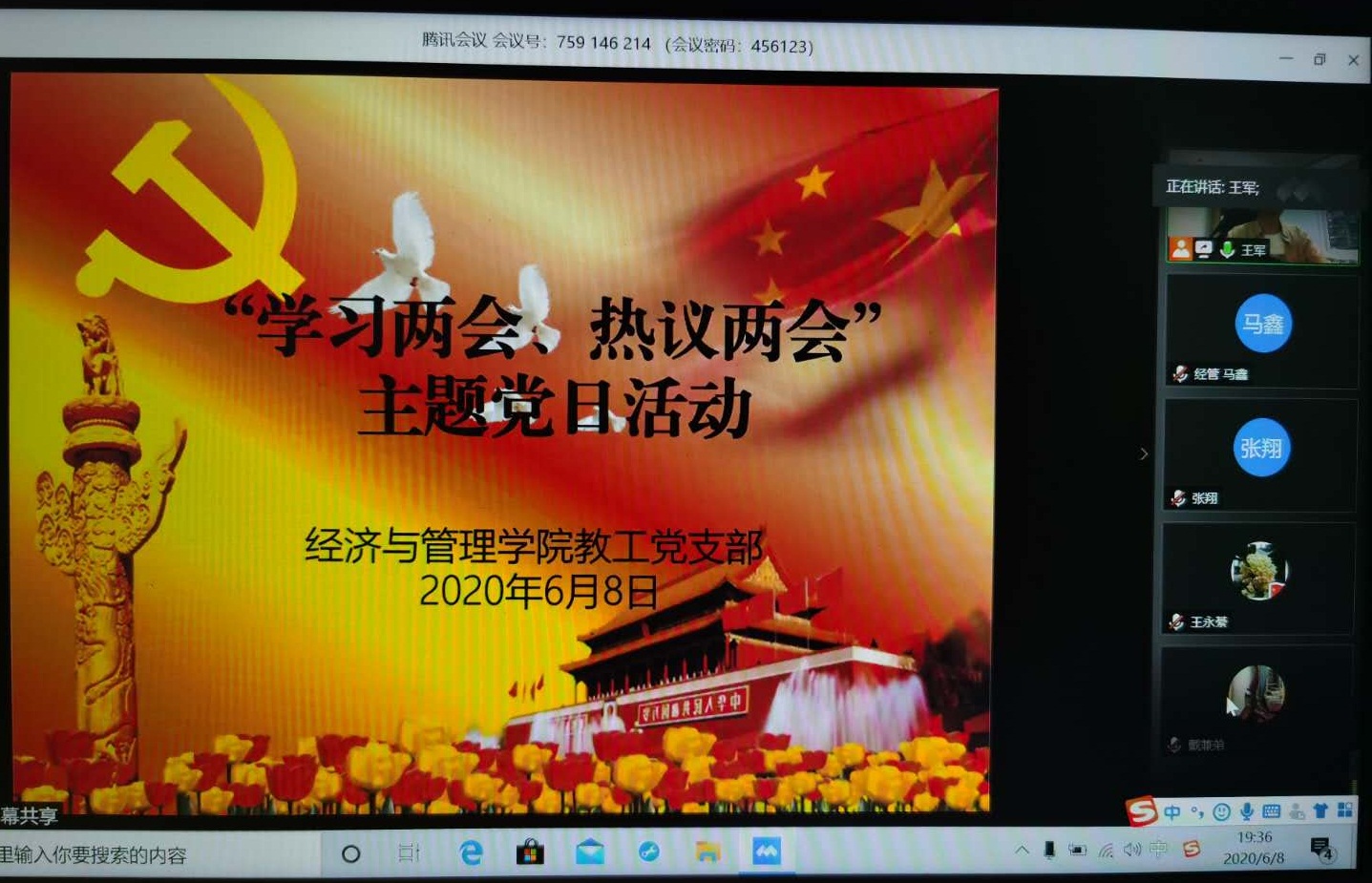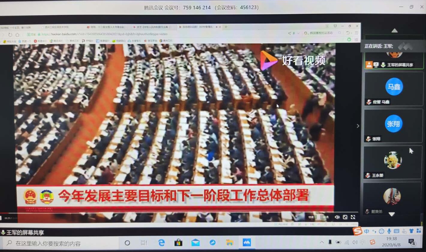 2020年6月8日晚,经济与管理学院教工党支部在线开展“学习两会、热议两会”主题党日活动。活动中,支部组织全体教职工党员及发展对象观看了《政府工作报告》、“关于《中华人民共和国民法典(草案)》的说明”“关于《全国人民代表大会关于建立健全香港特别行政区维护国家安全的法律制度和执行机制的决定(草案)》的说明”等视频,与会同志作交流发言。活动由支部书记王军主持。