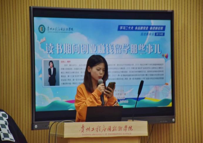 4月20日晚,由团委主办、经济与管理学院团总支承办的第152期流沧青年说在青年讲习所如期举行。此次活动由经管学院陈宇老师担任主讲嘉宾,以“读书期间创业赚钱留学那些事儿”为主题,分享她在大学期间如何通过半工半读实现经济独立、如何成功保送研究生,研究生期间如何创业赚钱并出国留学等个人经历及宝贵经验。经管学院22人力本1班杨贝禹同学担任主持,2022级财务管理专业70余名同学到场聆听。