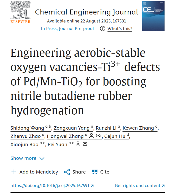 近日,我学院化工专业王世栋博士的研究成果“Engineering aerobic-stable oxygen vacancies-Ti3+defects of Pd/Mn-TiO2for boosting nitrile butadiene rubber hydrogenation”在材料科学领域顶级期刊《Chemical Engineering Journal》在线发表。