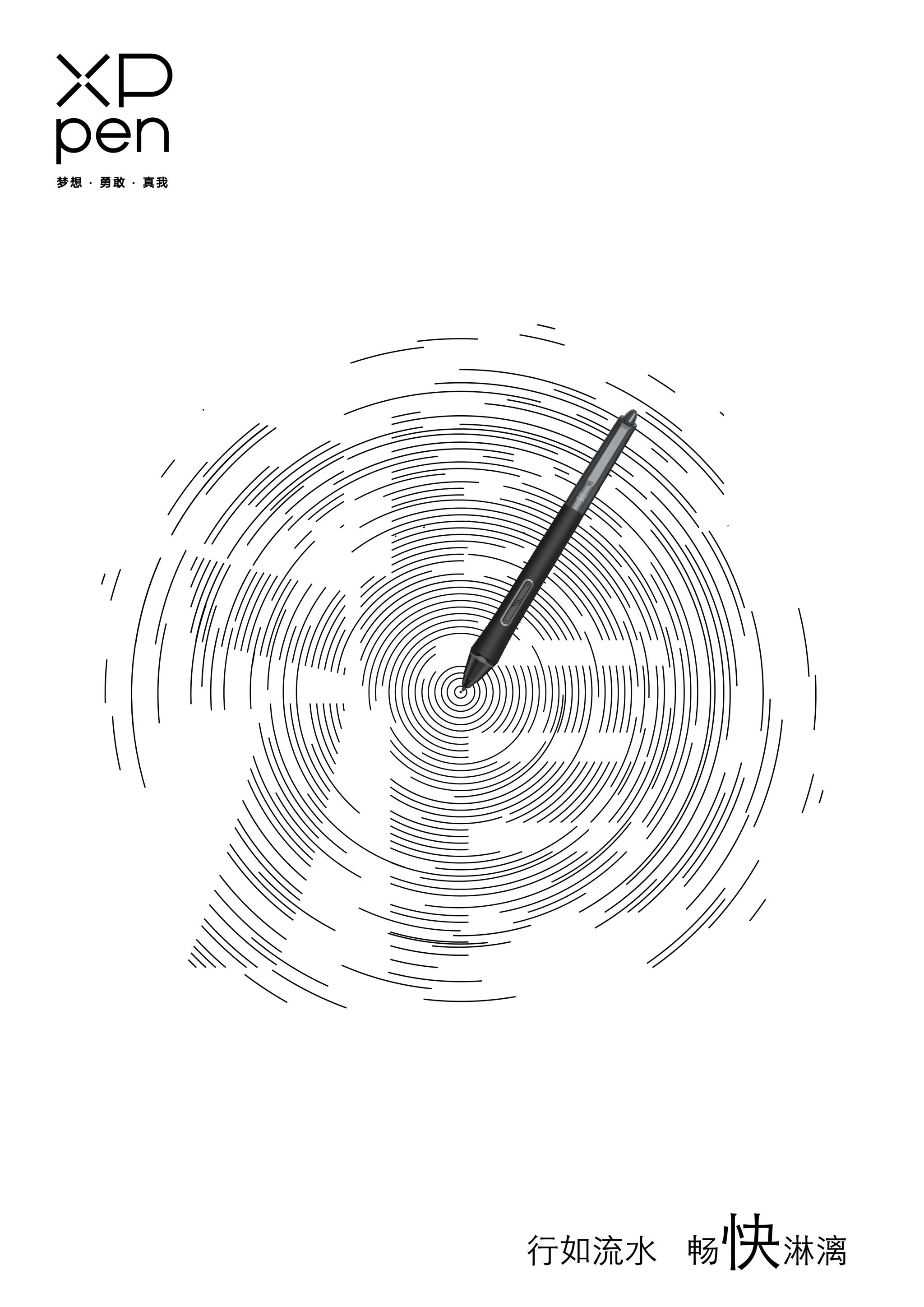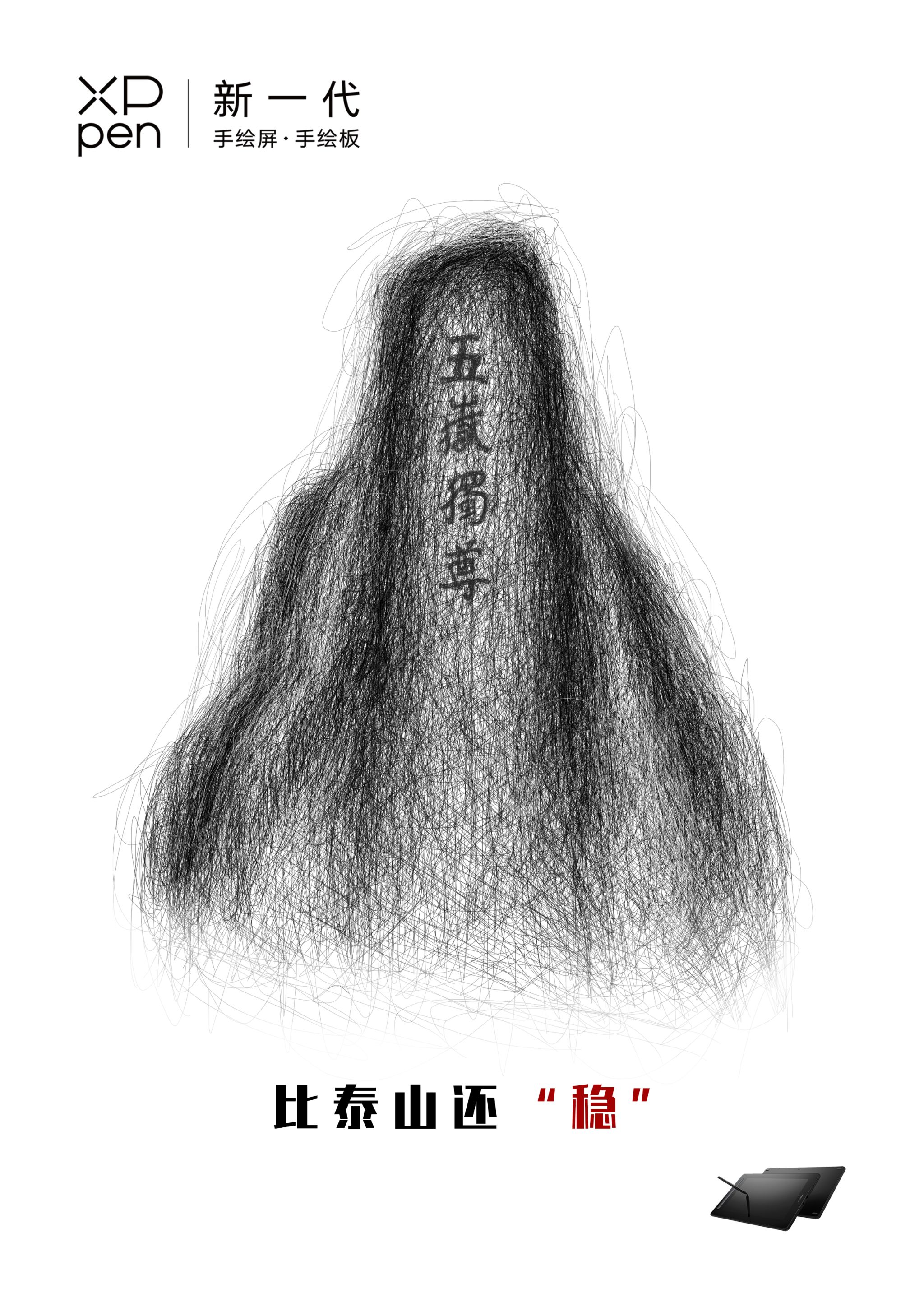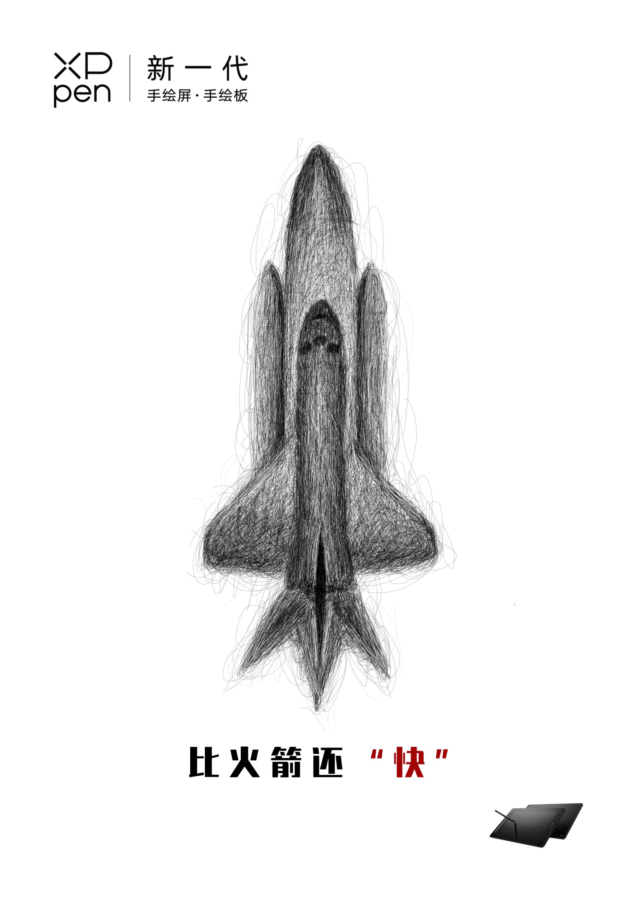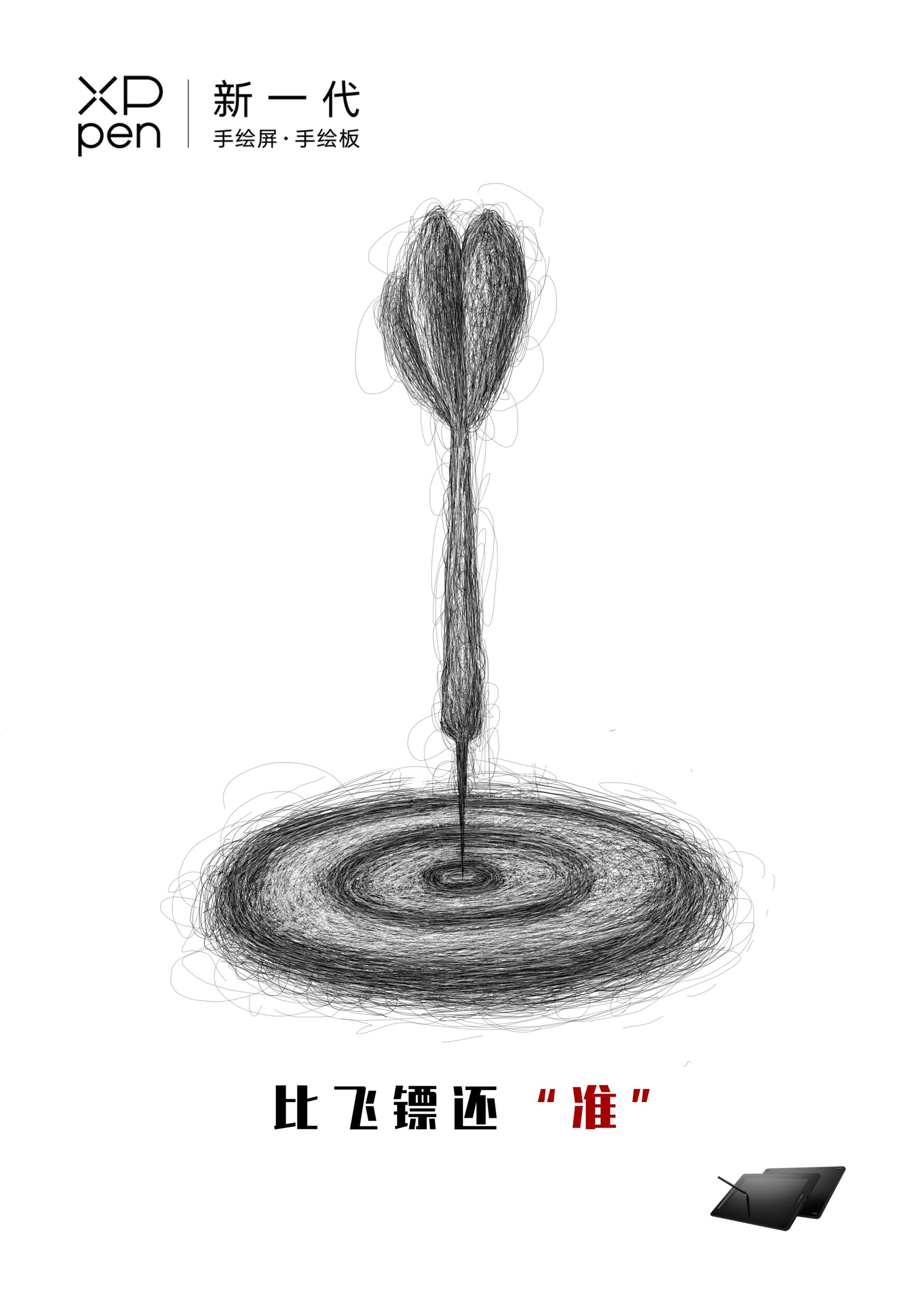 作品简介:该作品是以XP新一代手绘屏为主题进行的一系列设计创作。画面采用纯手绘的形式进行,利用平面构成中的设计元素-线,进行面化构成,形成飞镖、泰山、火箭的视觉形象。其中广告语部分,用红色字体突出重点,表达该产品的功能特点。