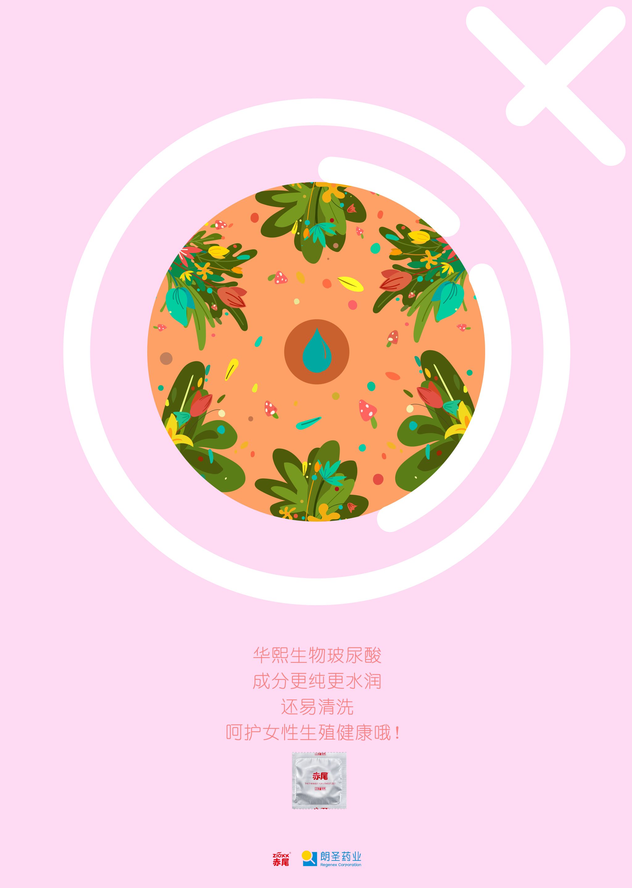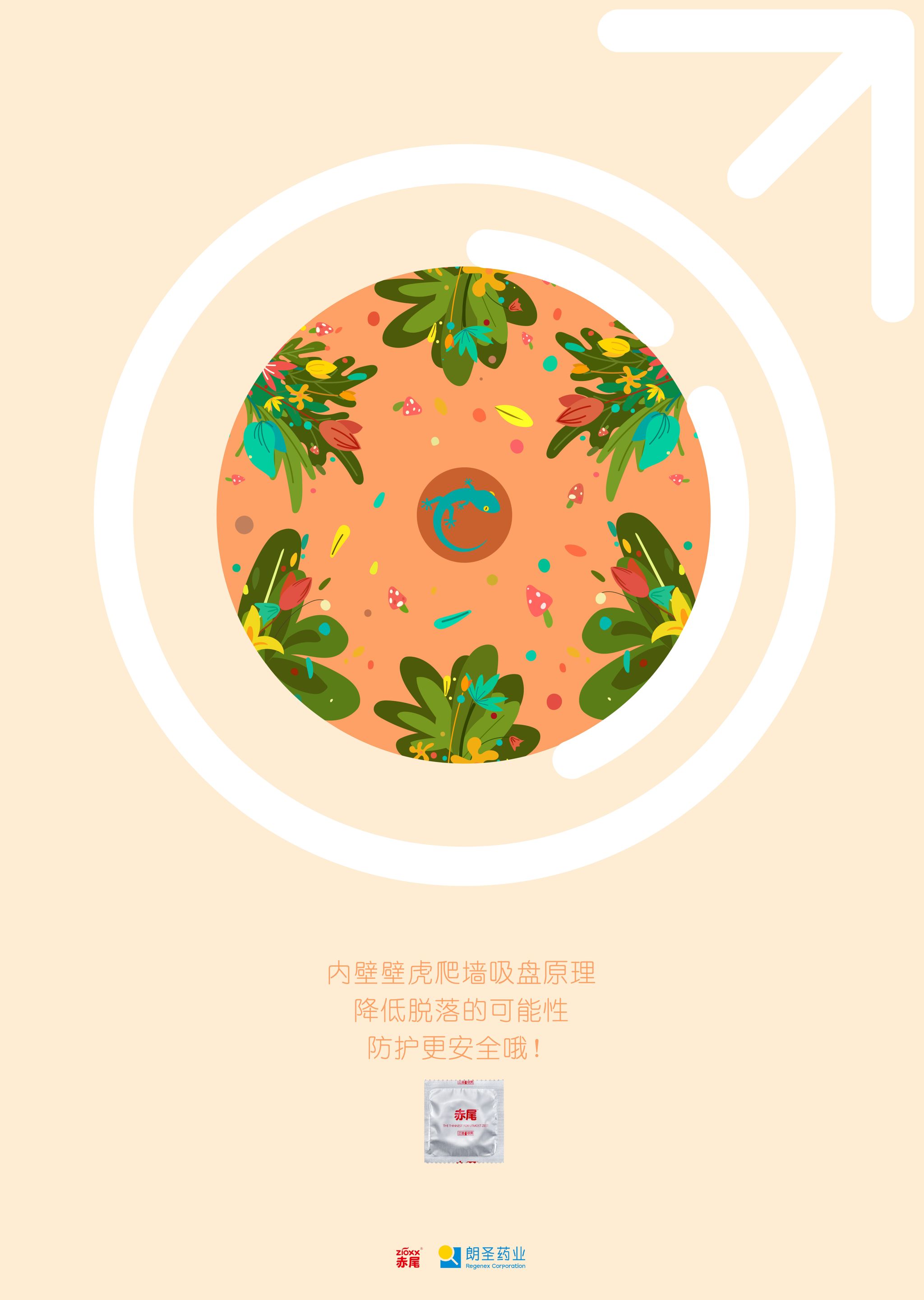 作品简介:海报采用了的扁平化风格,暖色调营造温馨氛围。男女符号与赤尾避孕套截面的巧妙融合,直观传达安全与爱的信息,巧妙的表达了赤尾避孕套的优点。
