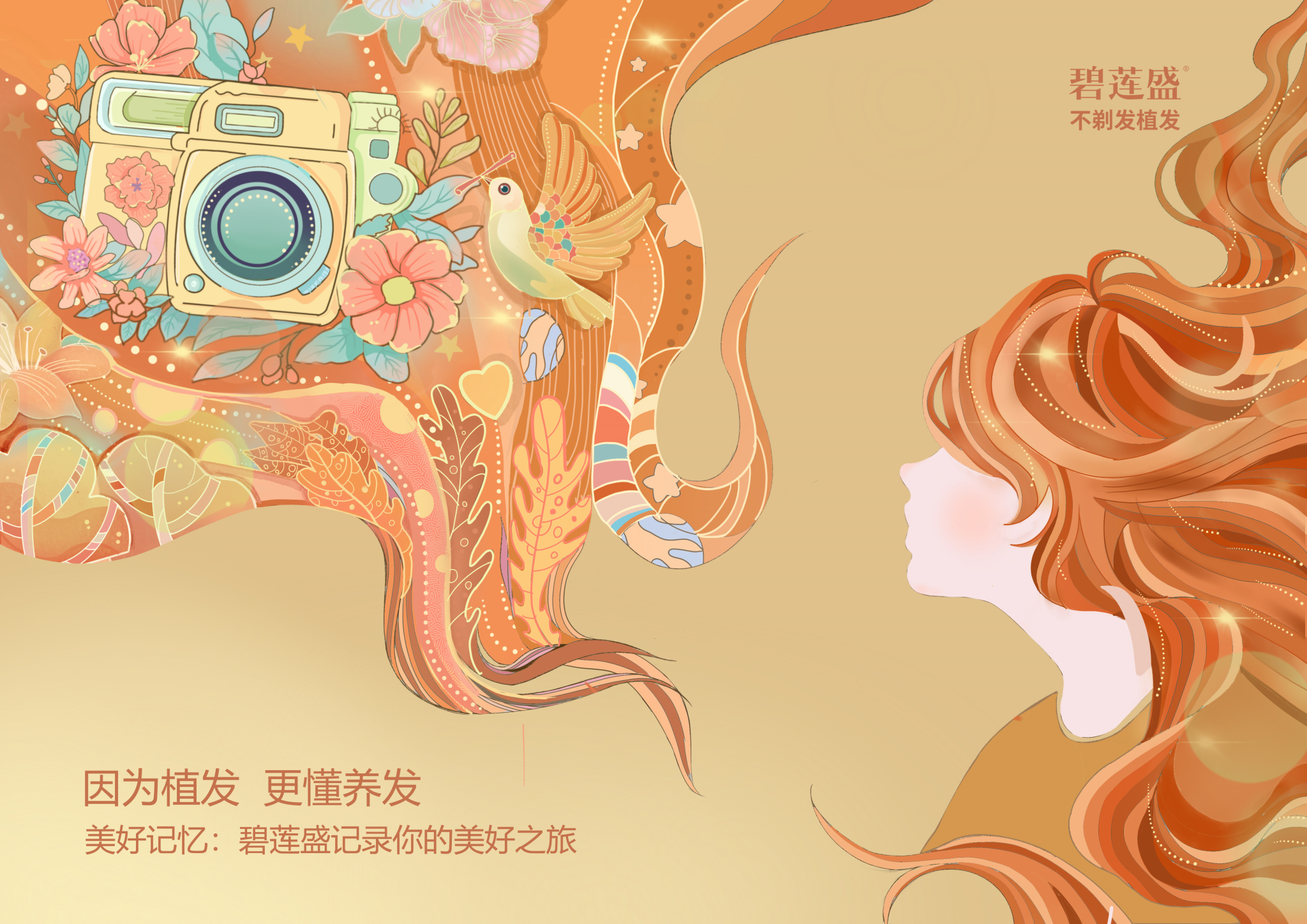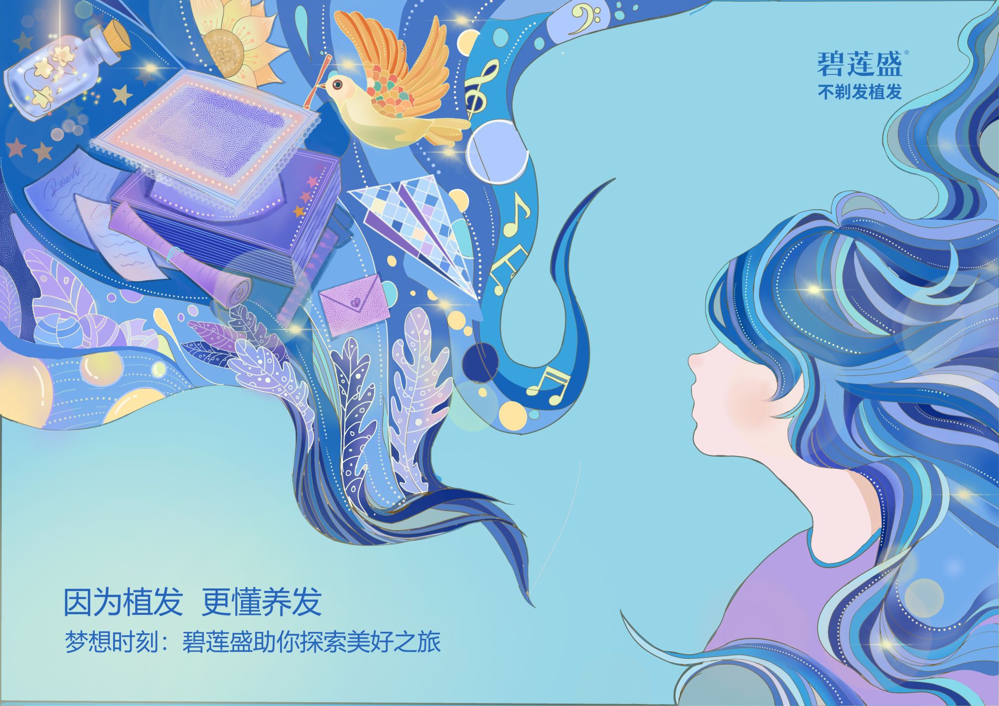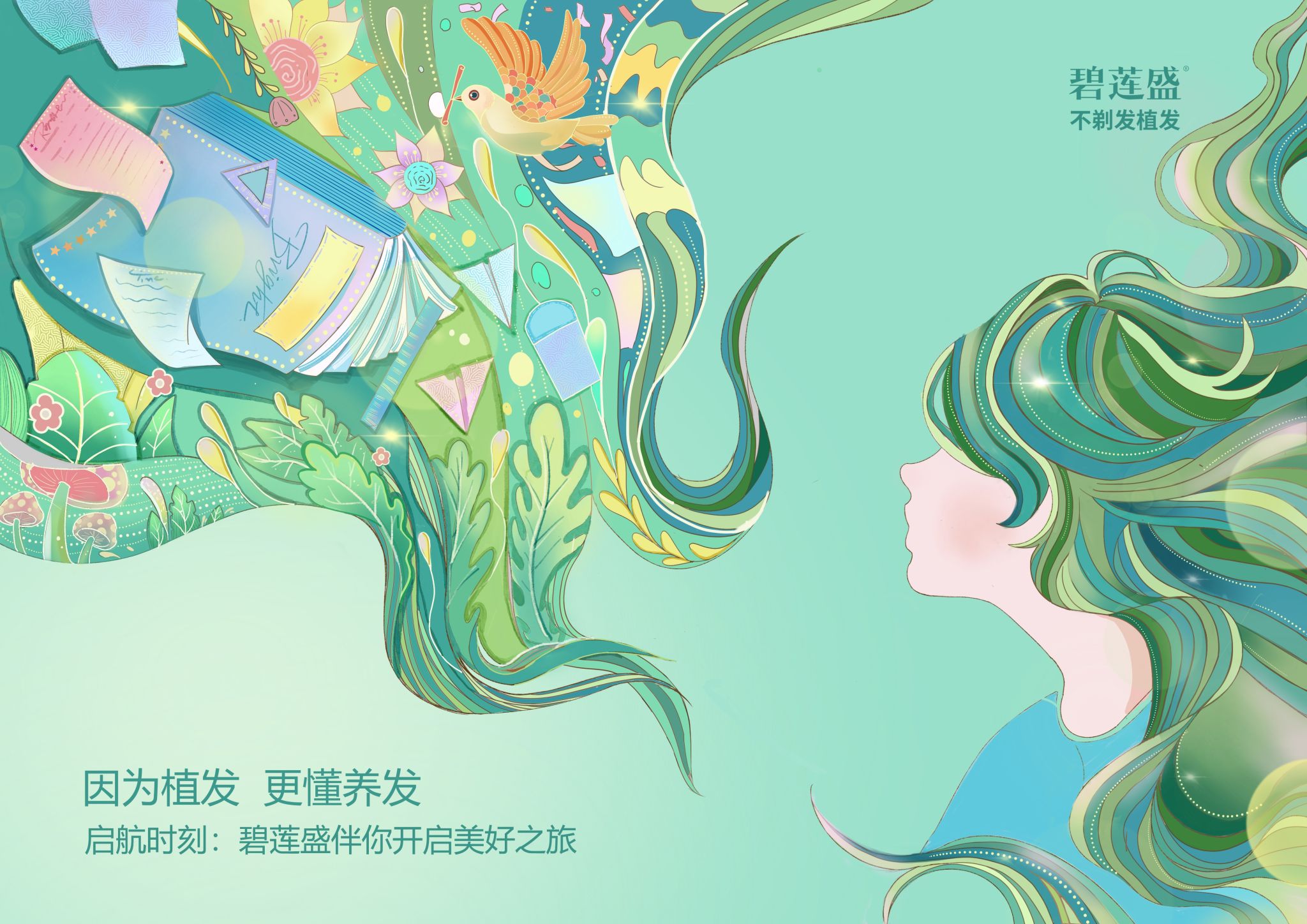 作品简介:作品设计以碧莲盛养发:“因为植发,更懂养发”为创作者概念,以“美好之旅“为创意主题,飘逸长发为元素,采用插画风格,将毕业季的场景与秀发元素同构表现,点明设计主题。分别运用了蓝、绿、黄三种主色调构成了3个生活画面,寓意拥有美好秀发,生活多姿多彩。
