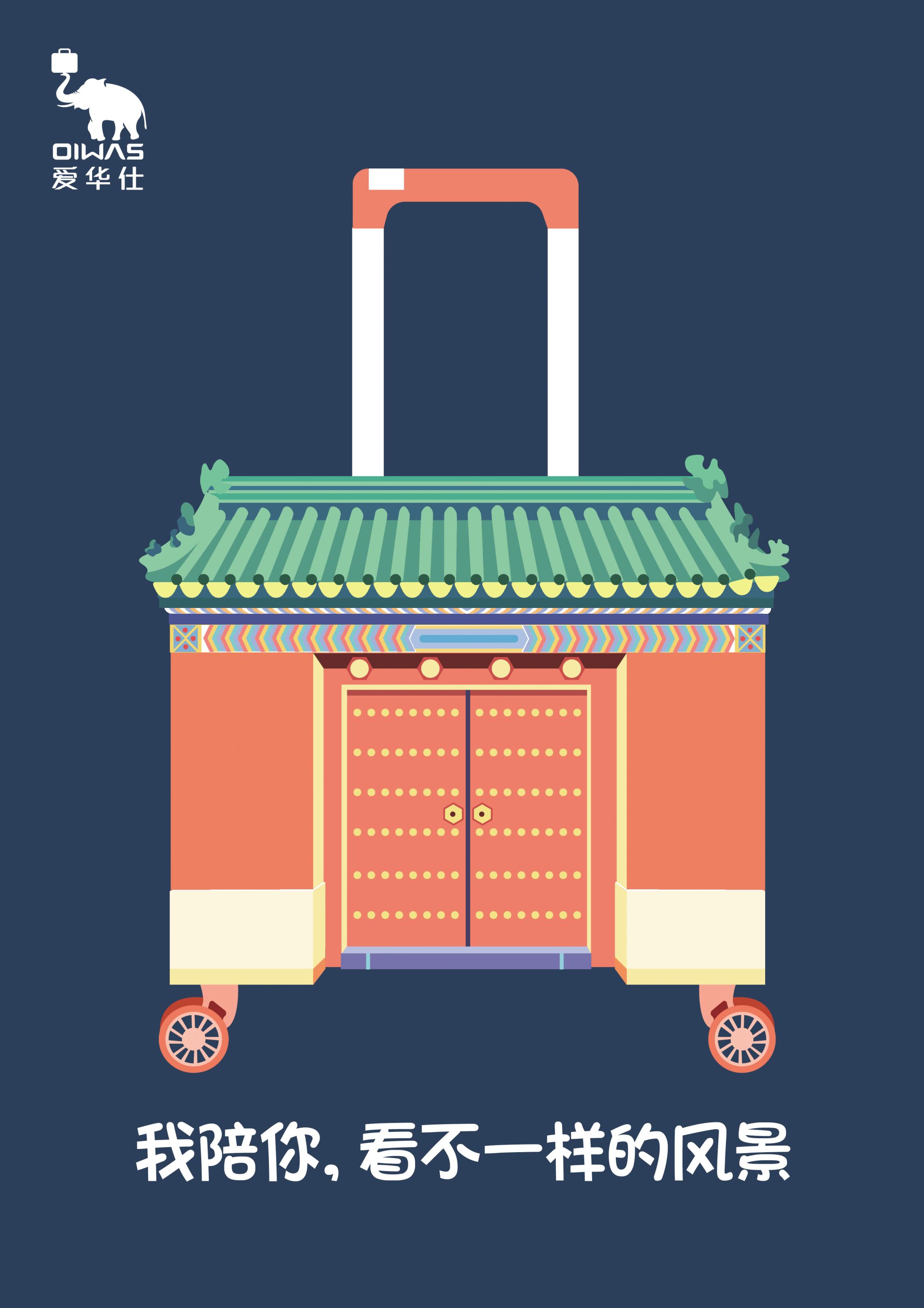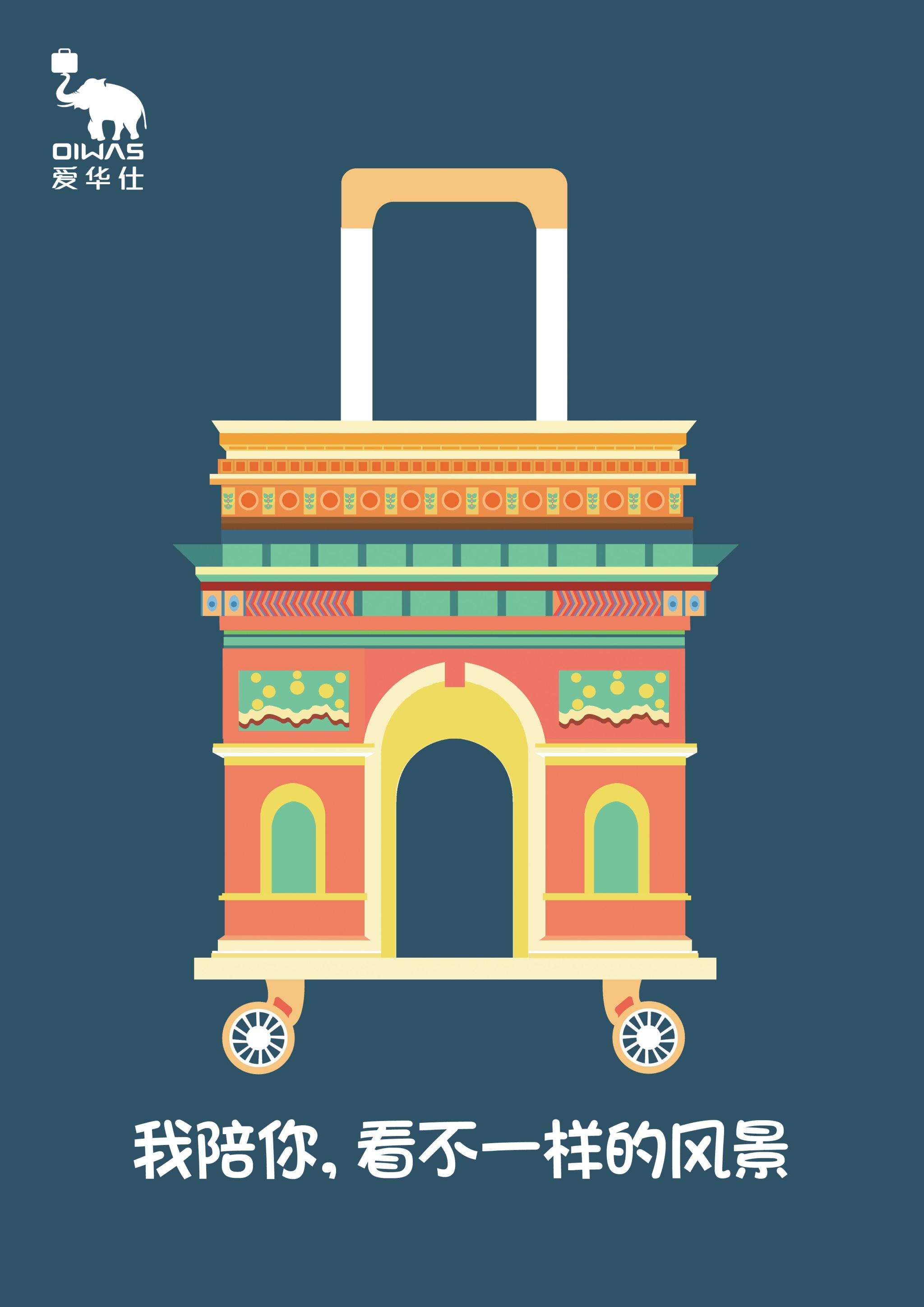 作品简介:该作品是以爱华仕行李箱为主题进行的系列海报设计创作。画面采用插画的形式进行表现,利用平面构成中的设计元素点线面,以国内城市代表性建筑故宫及国外凯旋门为主题元素进行绘制。视觉焦点以爱华仕行李箱的箱体为主视觉,色彩突出,爱华仕箱包不仅是装载物品的工具,更是陪伴大家探索世界追求梦想的伙伴。希望从而能够唤醒大家内心深处对旅行的向往。