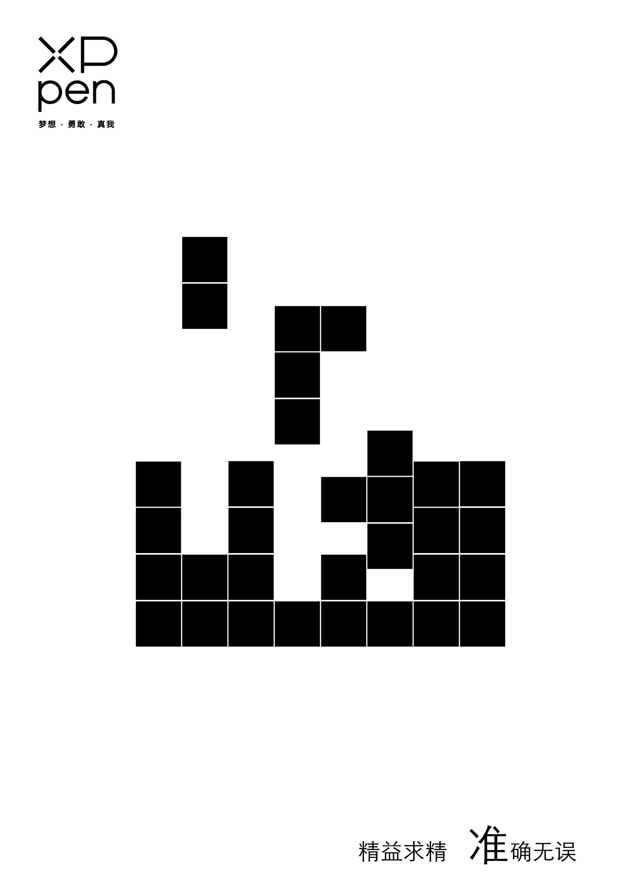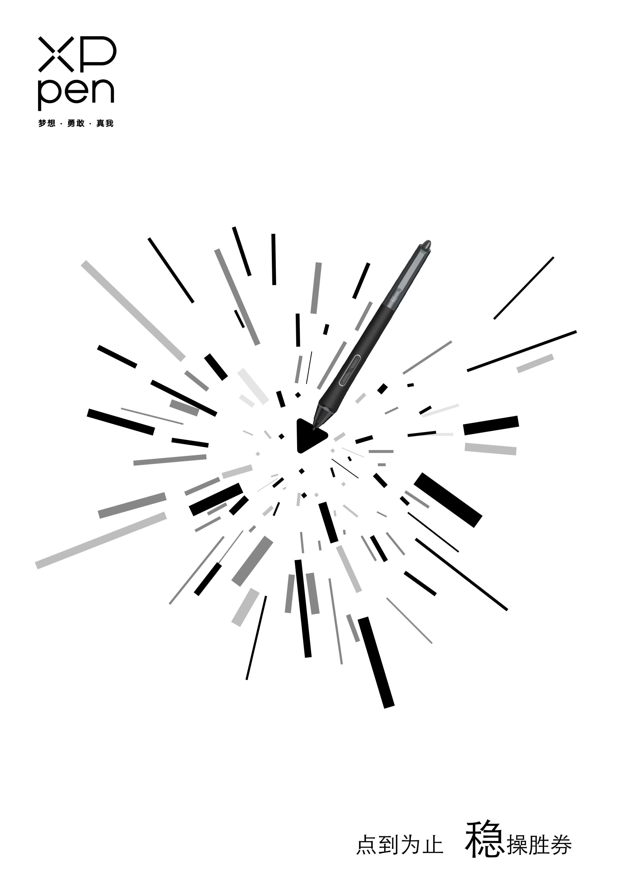 作品简介:作品分别采用了点线面三种构成要素,以简洁明了的画面突出XPpen的快,准,稳三种产品特征,表现产品就如流动的水,堆砌的俄罗斯方块和暂停键一般快速、准确、稳定。