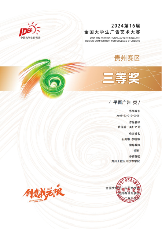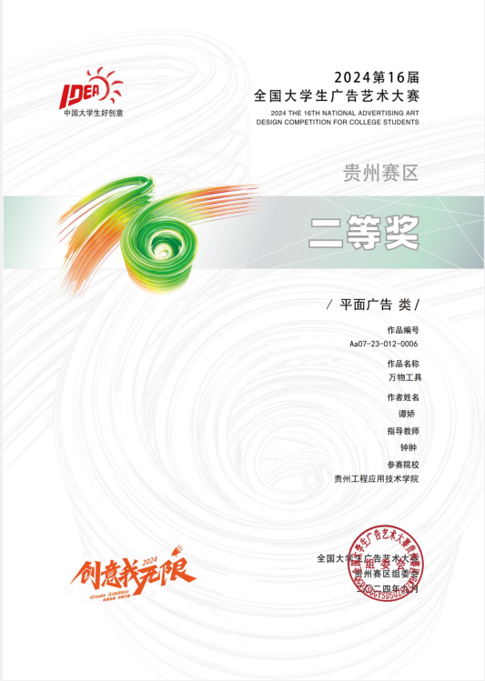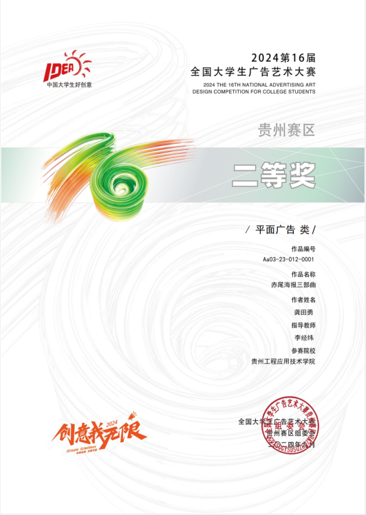 近日,2024年第16届全国大学生广告艺术大赛贵州赛区获奖名单已经公布。在贵州省级决赛中,由艺术学院学子代表贵州工程应用技术学院参赛的作品荣获二等奖4个、三等奖3个。