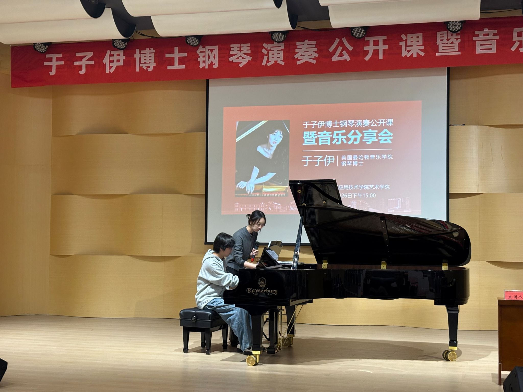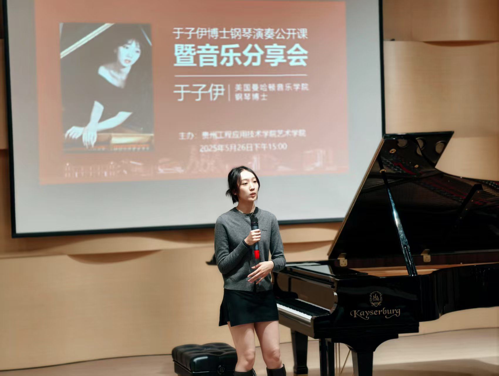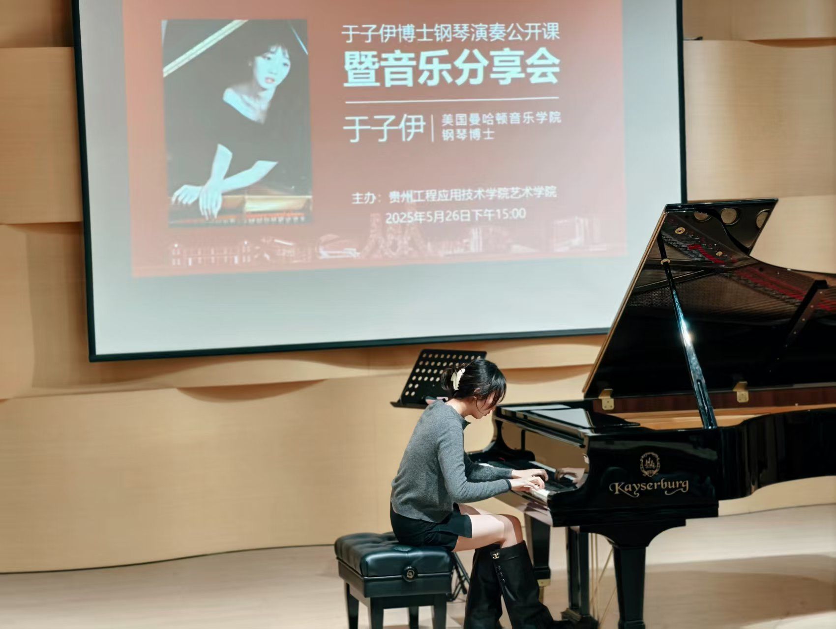 2025年5月26日下午,贵工程艺术学院音乐厅座无虚席,美国曼哈顿音乐学院钢琴博士、国际知名青年钢琴演奏家于子伊女士应邀举办了一场别开生面的钢琴演奏公开课暨音乐分享会,活动由艺术学院音乐系主任赵雪主持,艺术学院院长龚文富、副院长杨嵩参加聆听了本次钢琴音乐教学分享活动。活动分为钢琴音乐分享和钢琴演奏公开课指导教学两个部分,为现场师生带来了一场高水准的艺术盛宴。