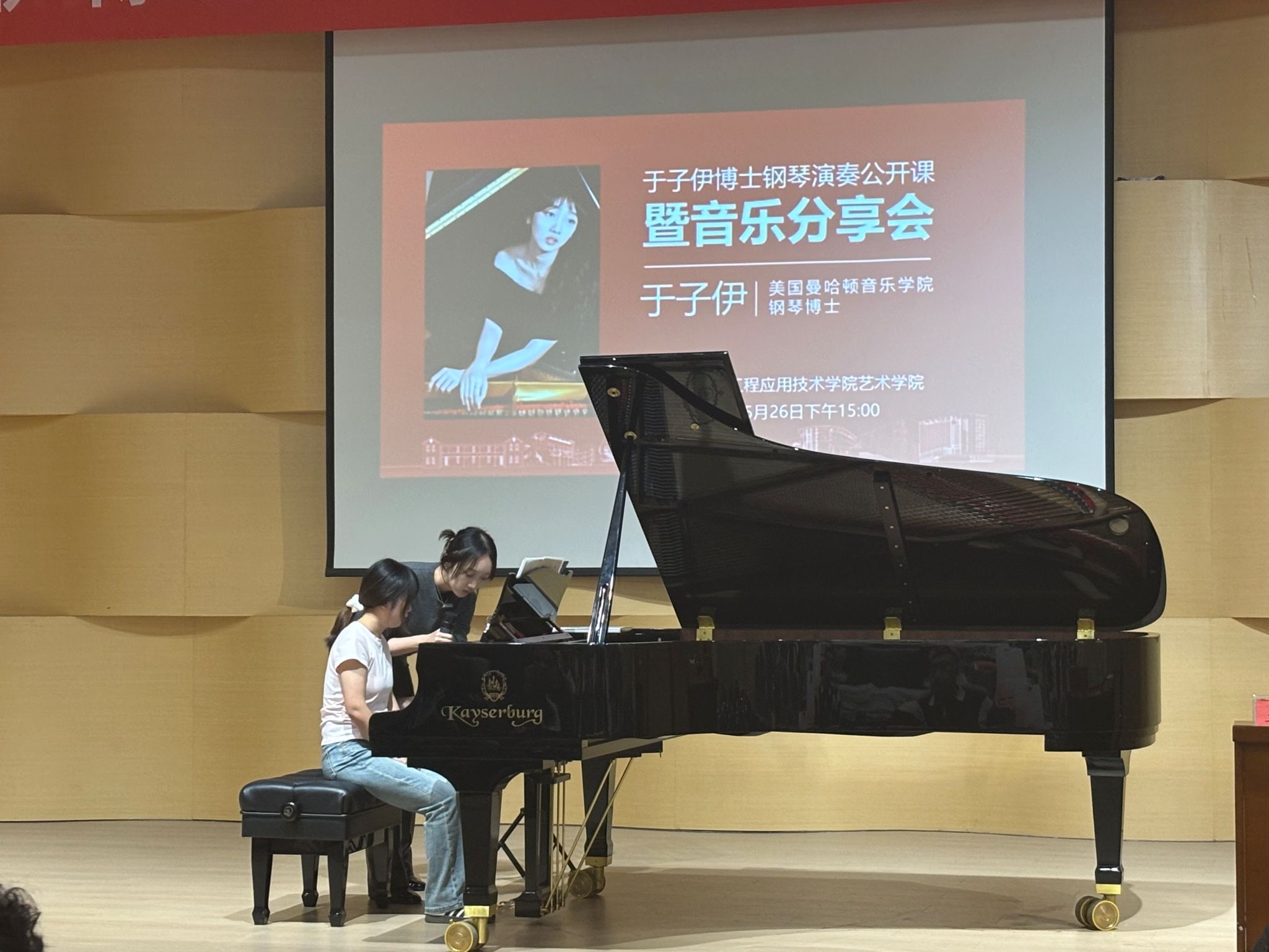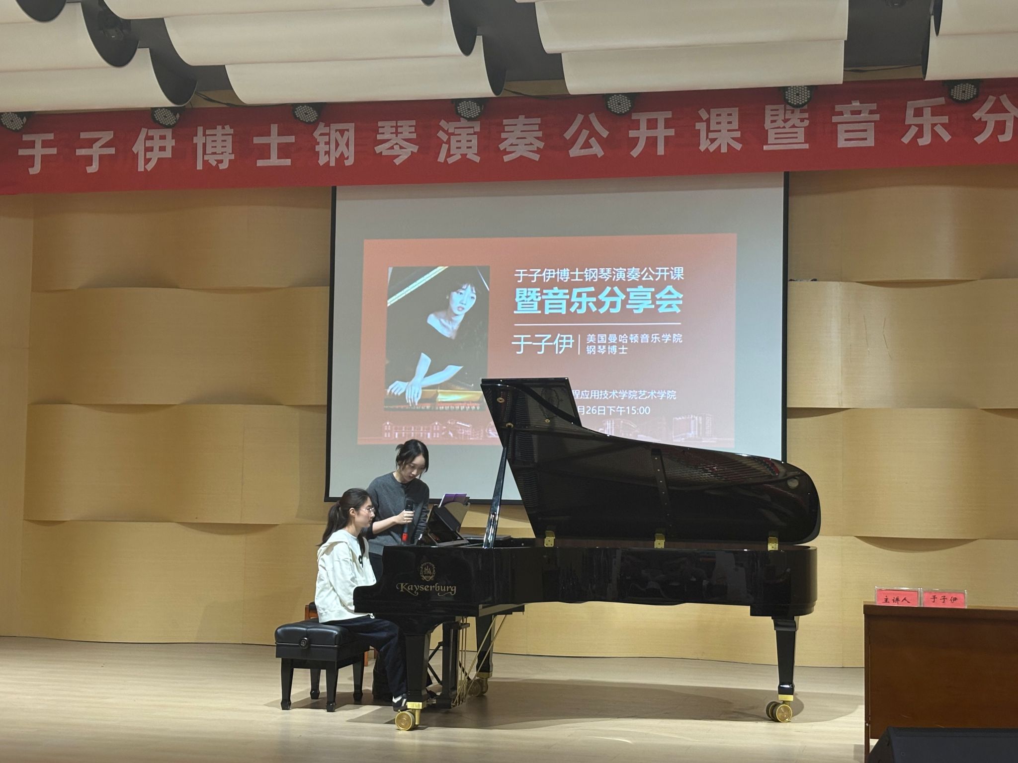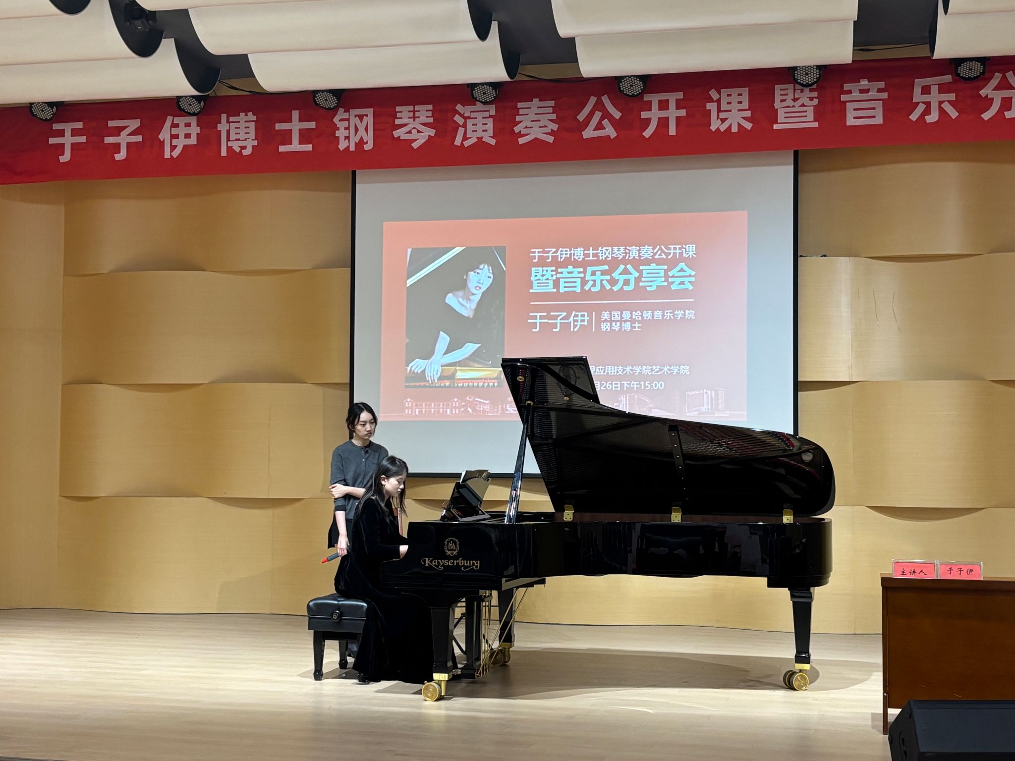 2025年5月26日下午,贵工程艺术学院音乐厅座无虚席,美国曼哈顿音乐学院钢琴博士、国际知名青年钢琴演奏家于子伊女士应邀举办了一场别开生面的钢琴演奏公开课暨音乐分享会,活动由艺术学院音乐系主任赵雪主持,艺术学院院长龚文富、副院长杨嵩参加聆听了本次钢琴音乐教学分享活动。活动分为钢琴音乐分享和钢琴演奏公开课指导教学两个部分,为现场师生带来了一场高水准的艺术盛宴。