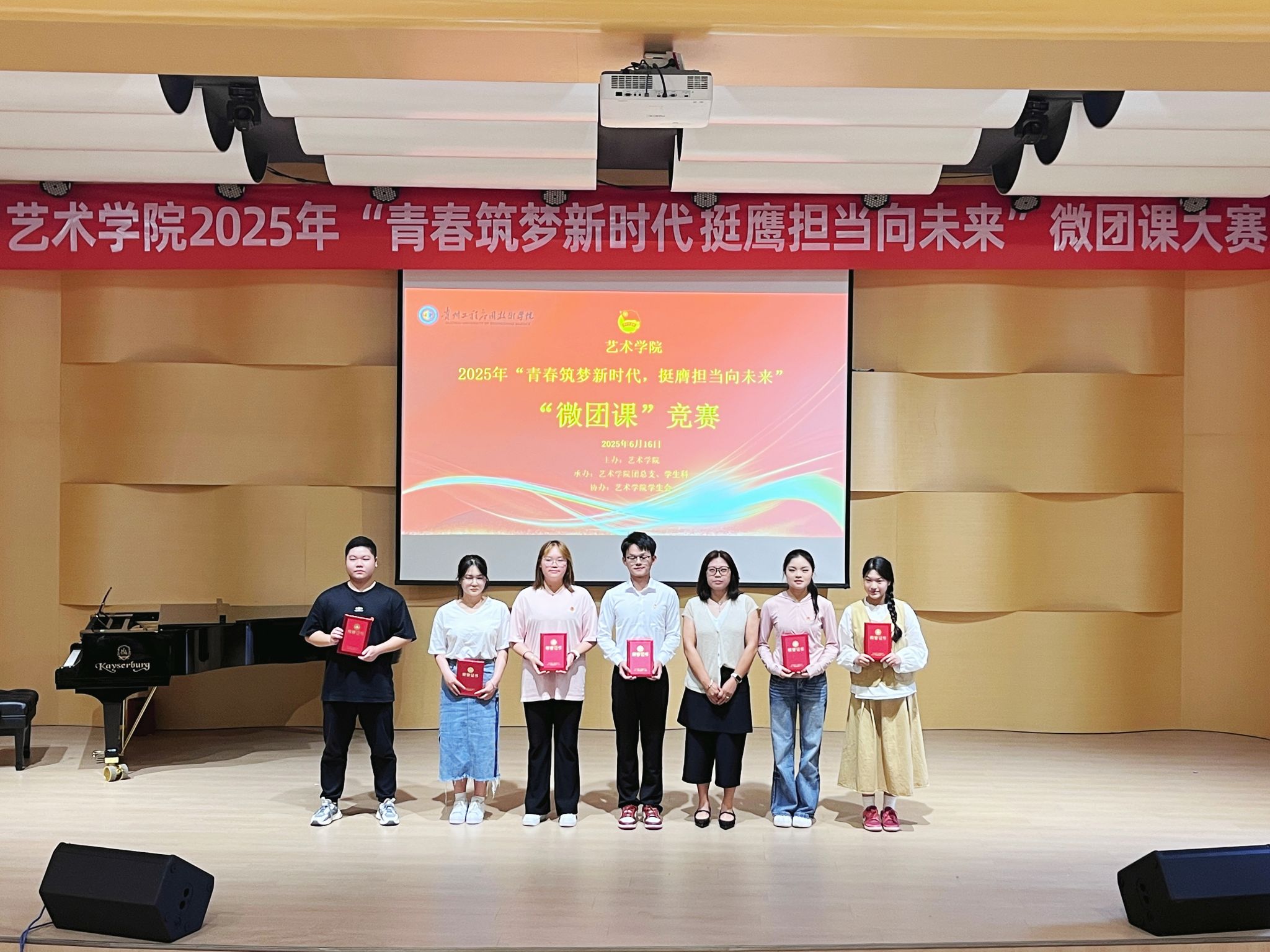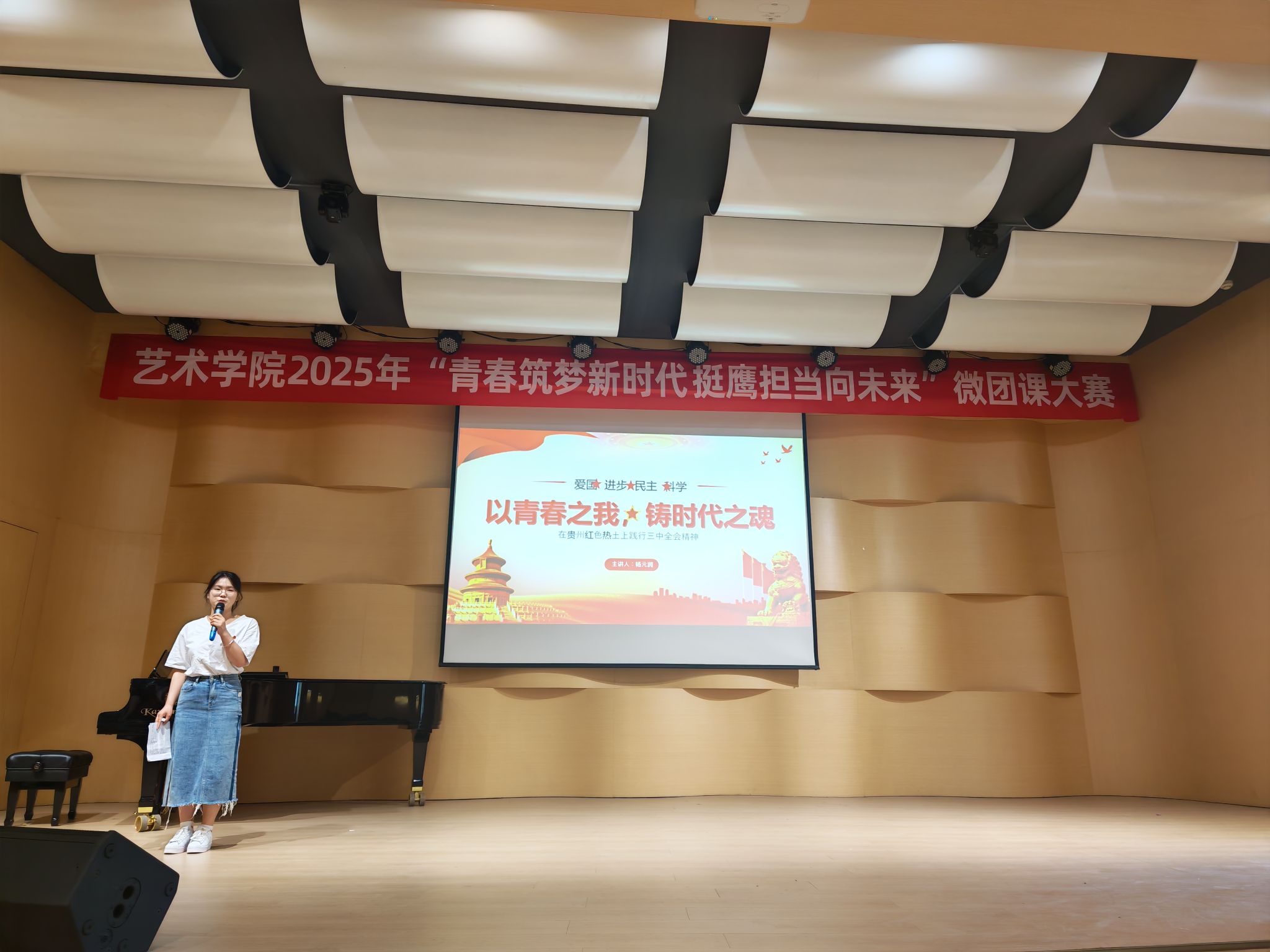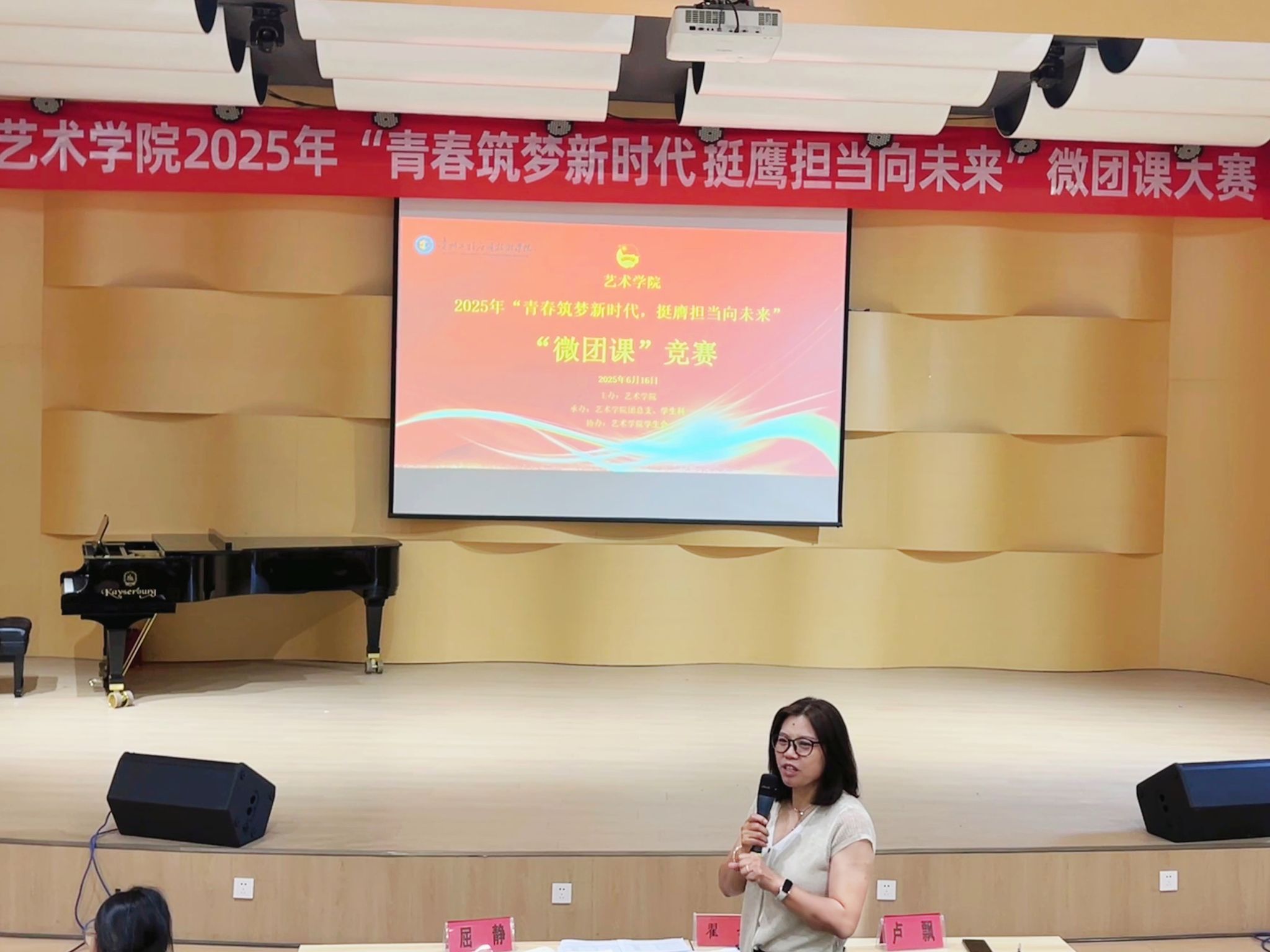 为深入学习贯彻党的二十大及二十届三中全会精神,引领青年学子深刻感悟思想伟力,勇担时代使命,6月16日下午15:30,艺术学院2025年团支部“微团课”竞赛决赛在艺术学院小音乐厅举行。艺术学院党总支副书记翟云、团总支副书记屈静、辅导员卢飘老师作为评委出席活动。