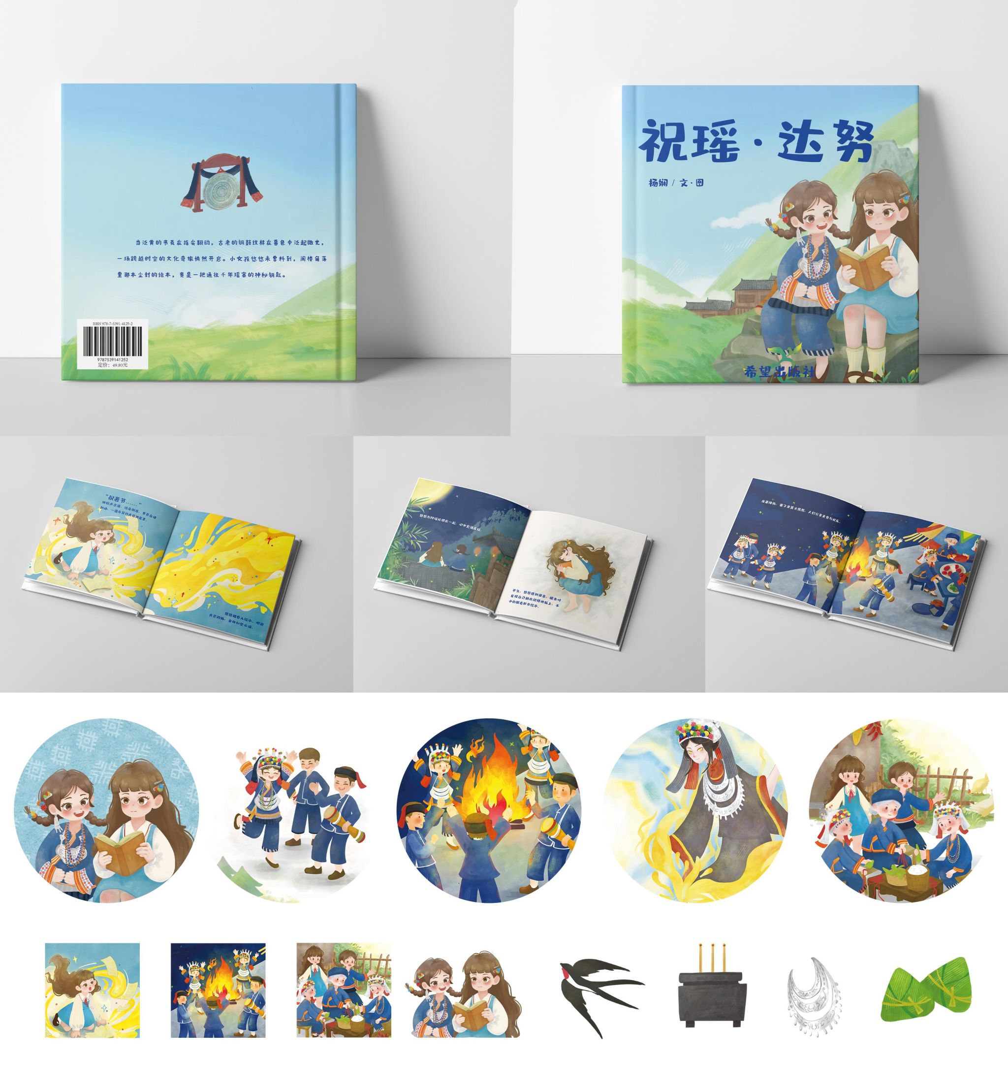作品简介:祝著节是瑶族重要的传统节日,流传于广西壮族自治区,是国家级非物质文化遗产之一。该节日以祭祀瑶族创世女神密洛陀为核心,承载着深厚的民族文化内涵。本设计以插画绘本的形式展开叙事,讲述一个小女孩无意间打开一本神秘书籍,穿越到瑶族村寨的奇幻故事。在视觉表现上,作品在保留瑶族服饰、习俗等民族习俗文化特征的基础上,采用儿插风格进行整体绘制,并使画面更具亲和力和趣味性。将祝著节融入儿童绘本的创作中,不仅能够增加年轻一代的文化认同感,还能以生动活泼的方式推动传统民俗文化的现代化传播,并助力非遗文化的活态传承。