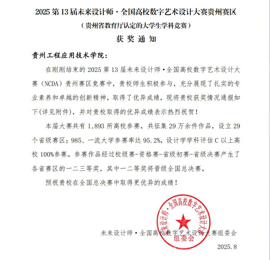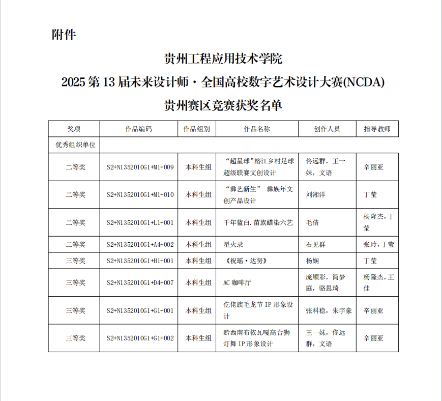 近日,2025第13届未来设计师·全国高校数字艺术设计大赛贵州赛区获奖名单已经公布。在贵州省级决赛中,由艺术学院学子代表贵州工程应用技术学院参赛的作品荣获二等奖4个、三等奖4个。