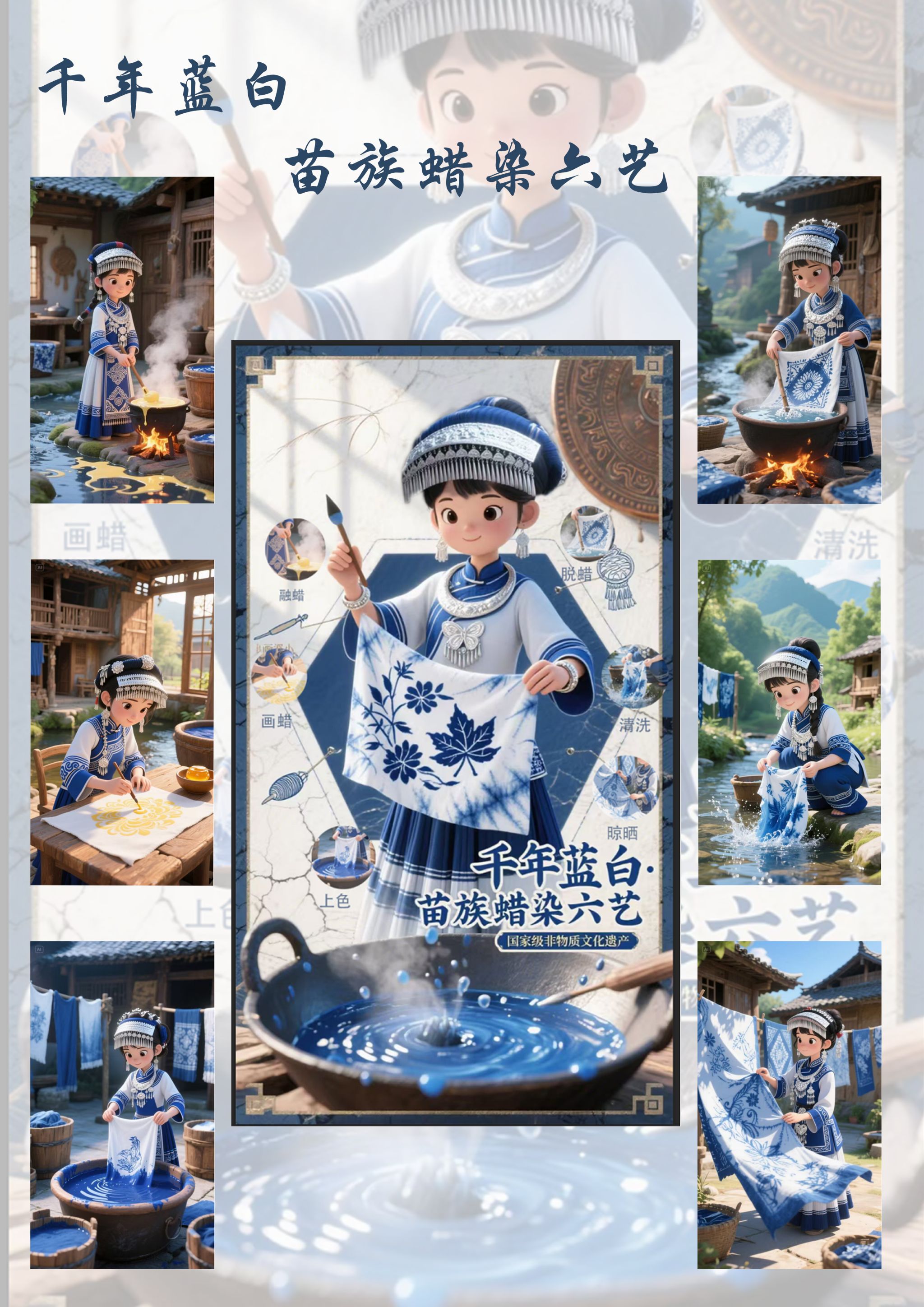 作品简介:采用AI绘画技术复现苗族蜡染的“蓝白”哲学,构建传统工艺与数字艺术的共生叙事。 以数字语言活化濒危工艺,通过“蓝白”色彩的情绪浓度(深蓝肃穆/浅蓝欢庆)唤醒文化基因,为乡村振兴中的非遗开发提供视觉原型。作品人物采用固定苗族女孩角色作为“文化向导”,增强情感联结,服饰融合苗族特征,对襟衣、螺旋纹银项圈、枫叶纹百褶裙、银冠高度还原苗族“喜鹊登梅”传承。这套作品主要围绕蜡染技艺“融蜡”“画蜡”“上色”“脱蜡”“清洗”“晾晒”六个关键步骤展开,生动呈现中国传统文化魅力。六步骤暗合苗族古歌《蝴蝶妈妈》中生命诞生的六个阶段,赋予工艺神圣性。采用3D卡通+动漫风格降低传统文化认知门槛。