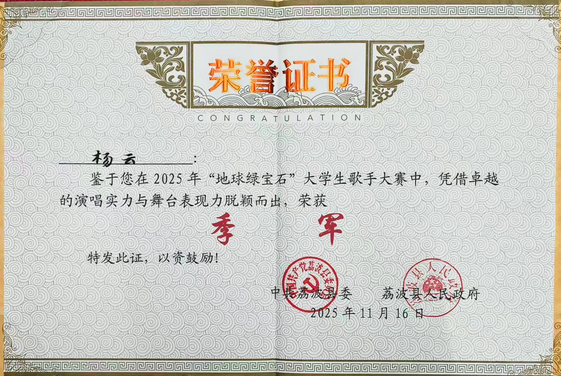 青春逐梦,声动荔波。杨云的亮眼表现,既是个人艺术素养的生动展现,更是当代大学生青春风采的鲜活注脚。未来,愿更多艺术学院青年学子以歌为媒,绽放才华,在时代舞台上书写精彩篇章!