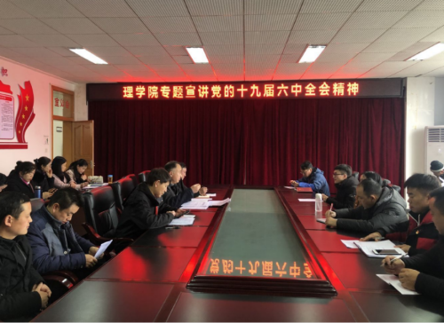 根据校党委《关于印发〈中共贵州工程应用技术学院委员会关于认真学习宣传贯彻党的十九届六中全会精神的实施方案〉的通知》精神及《中共贵州工程应用技术学院委员会关于认真学习宣传贯彻党的十九届六中全会精神的实施方案》(贵工程院党通【2021】37号),理学院党总支以“深入学习领会党的十九届六中全会精神,推进学院高质量发展”为主题,于2021年12月13日下午在本院会议室作党的十九届六中全会精神宣讲。宣讲会由党总支副书记、院长聂祥荣主持。