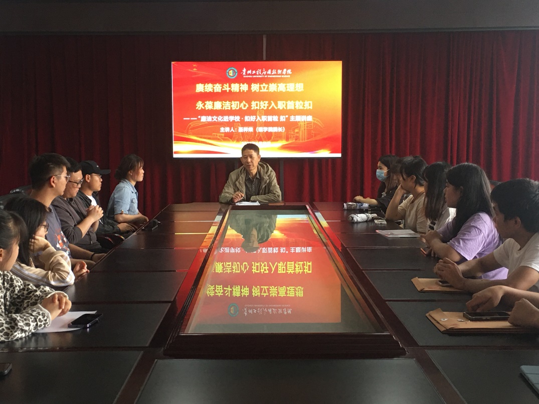 为贯彻落实党的二十大、二十届中央纪委二次全会精神﹐深入推进廉洁文化进校园,强化毕业生纪律意识、规矩意识、法律意识,扣好毕业生人生“第一粒扣子”。根据《市教育工委、市教育局关于印发毕节市2023年清廉学校建设工作方案的通知》要求,理学院于2023年6月19日在会议室组织毕业生代开展了“廉洁文化进学校.扣好入职首粒扣”主题讲座。