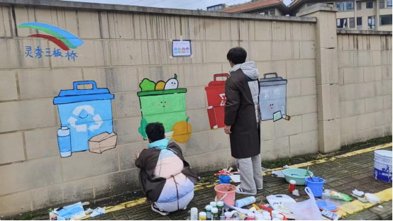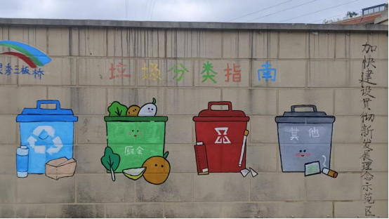 墙绘中清晰展示了四色分类垃圾桶,分别对应可回收物、厨余垃圾、有害垃圾和其他垃圾,形象普及垃圾分类知识,引导居民改善社区环境。