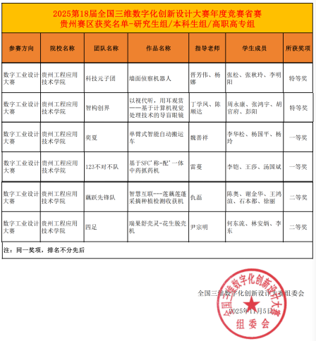 近日,第18届2025全国三维数字化创新设计大赛贵州赛区决赛获奖名单公布,由我院团总支指导组建的6支代表队在此次大赛中表现出色,全部获奖。荣获特等奖2项(拟推国赛作品)、一等奖2项和二等奖2项。本次大赛选拔过程严谨,经学生自主报名、全国组委会审核、网上初评等环节,共遴选出73支团队参加贵州赛区决赛,竞争激烈。