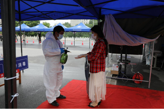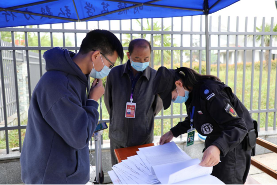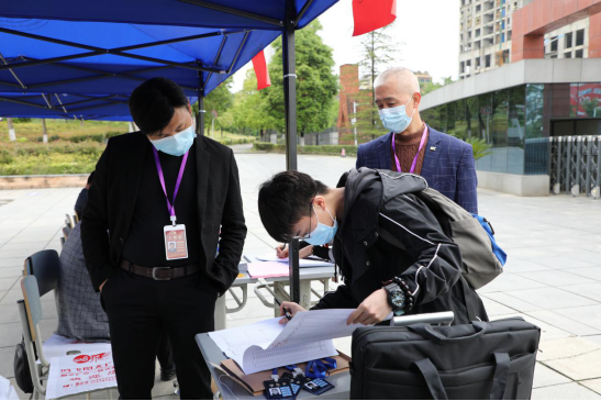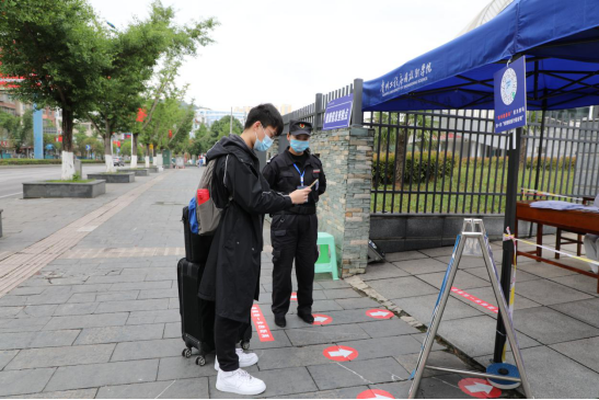 在报到点,工作人员积极引导返校学生,返校学生保持间隔1米以上排队依次进行扫描健康码、核验身份、体温测量、行李消毒、更换口罩、发放出入证等,最后才放行入校。通过合理的分工协作和精心组织,报道现场秩序井然,确保了每一位返校学生安全、有序进入校园。
